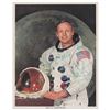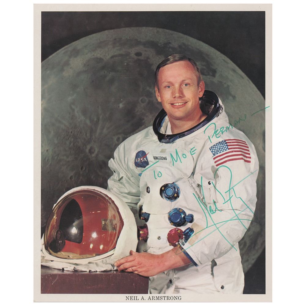 Official color 8 x 10 NASA lithograph of Neil Armstrong in his white space suit against a lunar background, signed and inscribed in green felt tip, "To Moe Perman—Neil Armstrong.†In fine condition. Armstrong very rarely signed in green ink.
