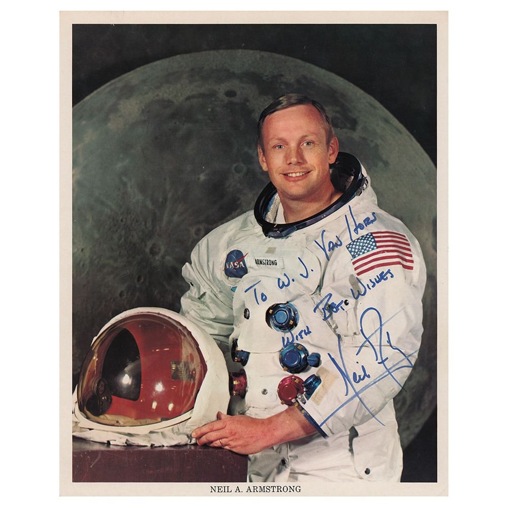 Official color 8 x 10 NASA lithograph of Neil Armstrong posing in his white space suit against a lunar backdrop, signed and inscribed in blue felt tip, "To W. J. Van Hors, With Best Wishes, Neil Armstrong.” In very good to fine condition, with light bends and creases, and some surface impressions to the upper left corner.