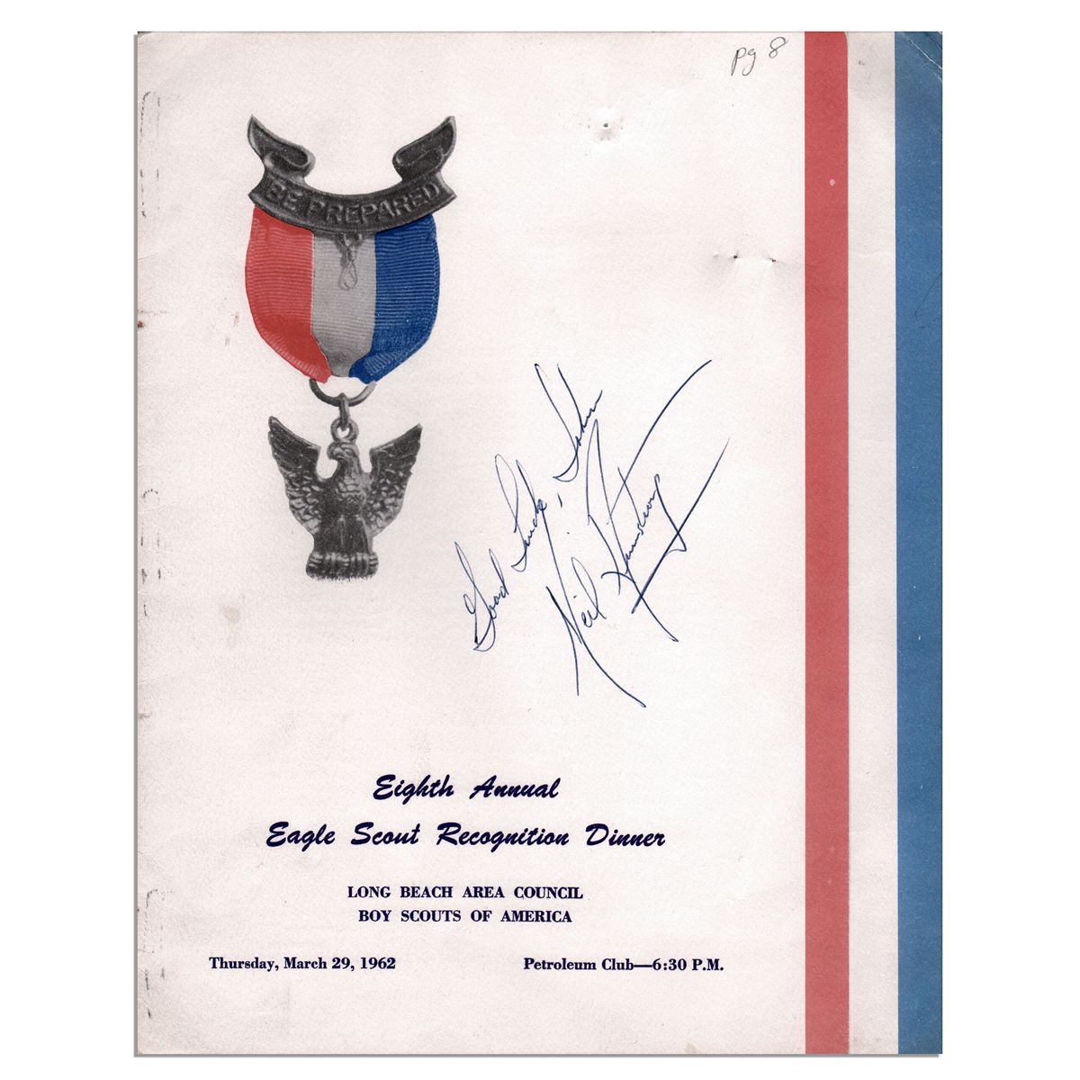 Neil Armstrong signed Boy Scout program. Before becoming the first man to walk on the moon Armstrong signs and inscribes the cover: ''Good luck, John / Neil Armstrong'' in blue ink. He's listed in this 1962 Long Beach Eagle Scout Recognition Dinner program as a guest speaker. His speech is titled ''X-15'', the name of the aircraft he flew as a test pilot at Edwards Airforce Base. A lifelong supporter of the scouting program, Armstrong was recognized in his adult life by the Boy Scouts of America with its Distinguished Eagle Scout Award and Silver Buffalo Award. While flying to the moon on Apollo 11, Armstrong announced: ''I'd like to say hello to all my fellow Scouts and Scouters at Farragut State Park in Idaho having a National Jamboree there this week. And Apollo 11 would like to send them best wishes''. Program runs 4pp. and measures 8.75'' x 11''. A few pinholes and surface impressions along left side of cover. Tape residue upon back cover, overall very good.