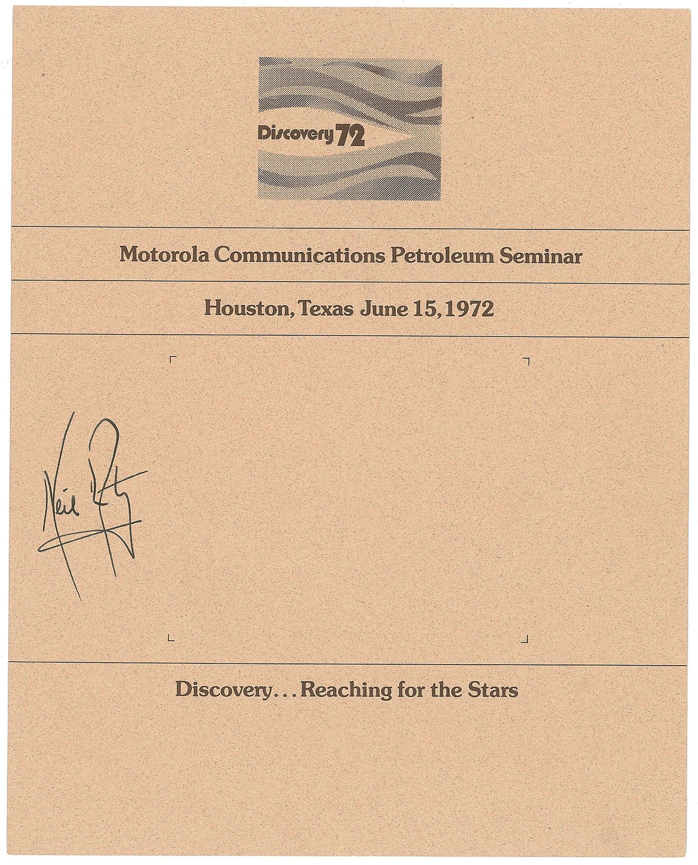 Program front cover for the Motorola Communications Petroleum Seminar held in Houston, Texas, on June 15, 1972, signed in black ink by Neil Armstrong. In fine condition.