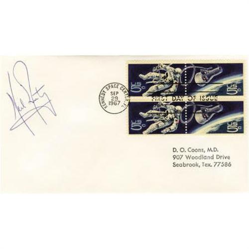 <B>Neil Armstrong Space First Day Cover Signed</B></I> “<I>Neil Armstrong,</B></I>” 6.5” x 3.5”. A block of four 5¢ stamps, two pairs of the 5¢ se-tenant Gemini 4 “Walk-in-Space” commemoratives, has been affixed, postmarked Kennedy Space Center, Florida, September 29, 1967, First Day of Issue. Gemini 4 Astronaut Edward H. White II had made the first U. S. space walk in 1965; he was one of three astronauts who were killed in the Apollo 1 fire on January 27, 1967. The envelope bears the name and Seabrook, Texas address of “<I>D. O. Coons, M.D.</B></I>” indicating the first day cover (unsigned) was mailed from the Kennedy Space Center to Dr. Coons in the Houston suburb of Seabrook. Dr. D. Owen Coons was NASA's flight doctor. His suggestion that an umbilical line that could be plugged into the spacecraft and plugged into Ed White's suit must be built and combined with an emergency source of oxygen made White's spacewalk possible. Both White and Armstrong, the first man to walk on the Moon, were in the second group of astronauts selected in 1962. This signed envelope is from Dr. Coons' collection.<BR><BR><b>Shipping:</b> Flatware (<a target="_blank" href="http://www.heritageauctions.com/common/shipping.php">view shipping information</a>)