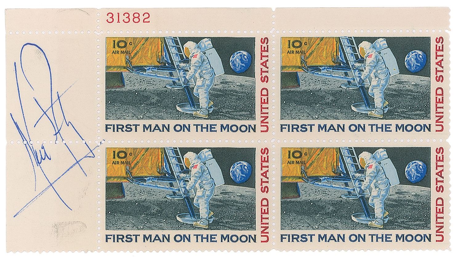 Appealing block of four ten-cent 'First Man on the Moon' postage stamps issued in 1969, 5 x 2.75, neatly signed in the wide left margin in blue ballpoint by Neil Armstrong. In fine condition.