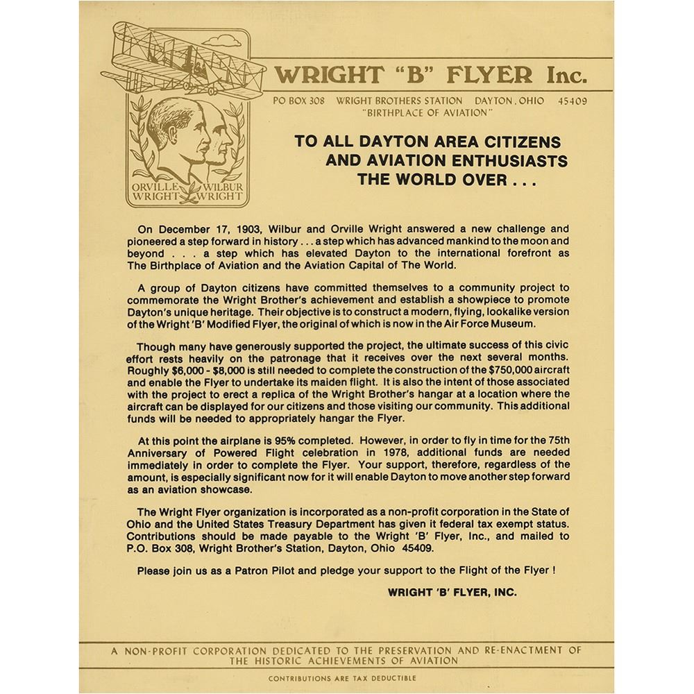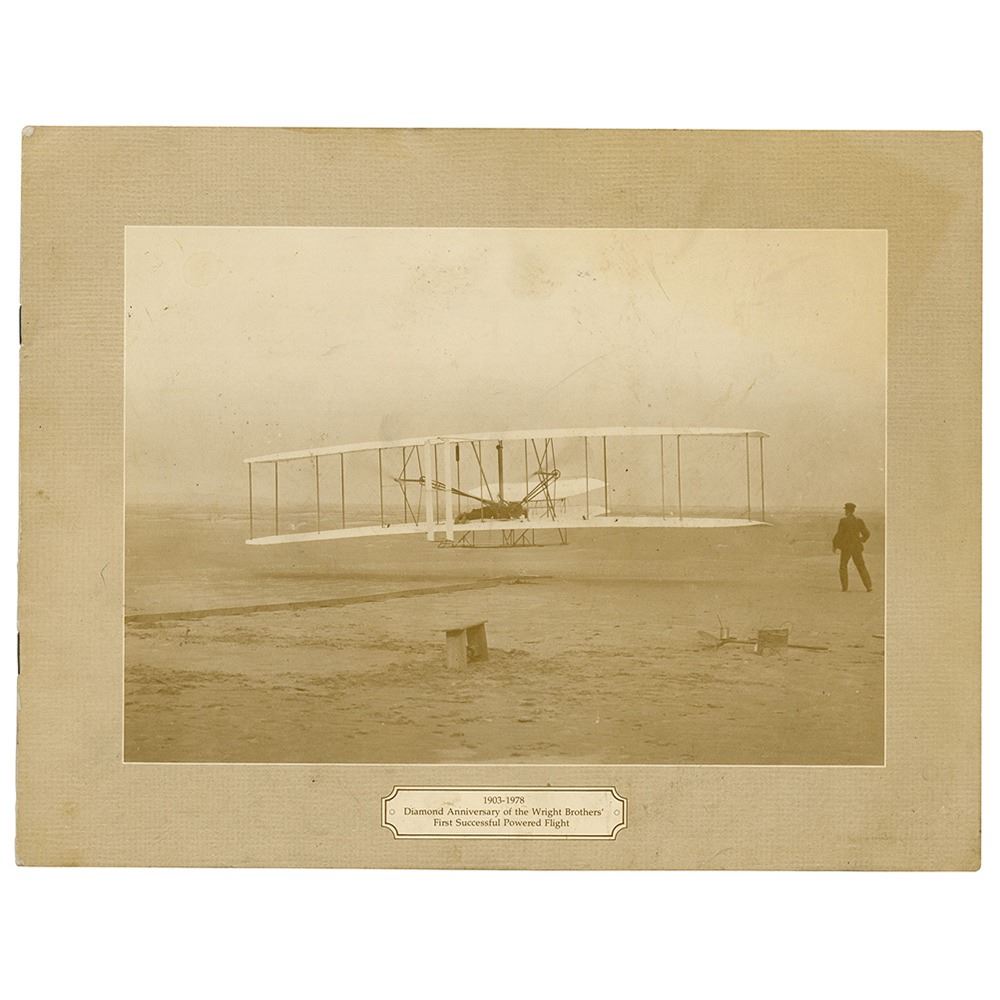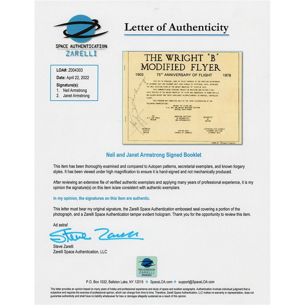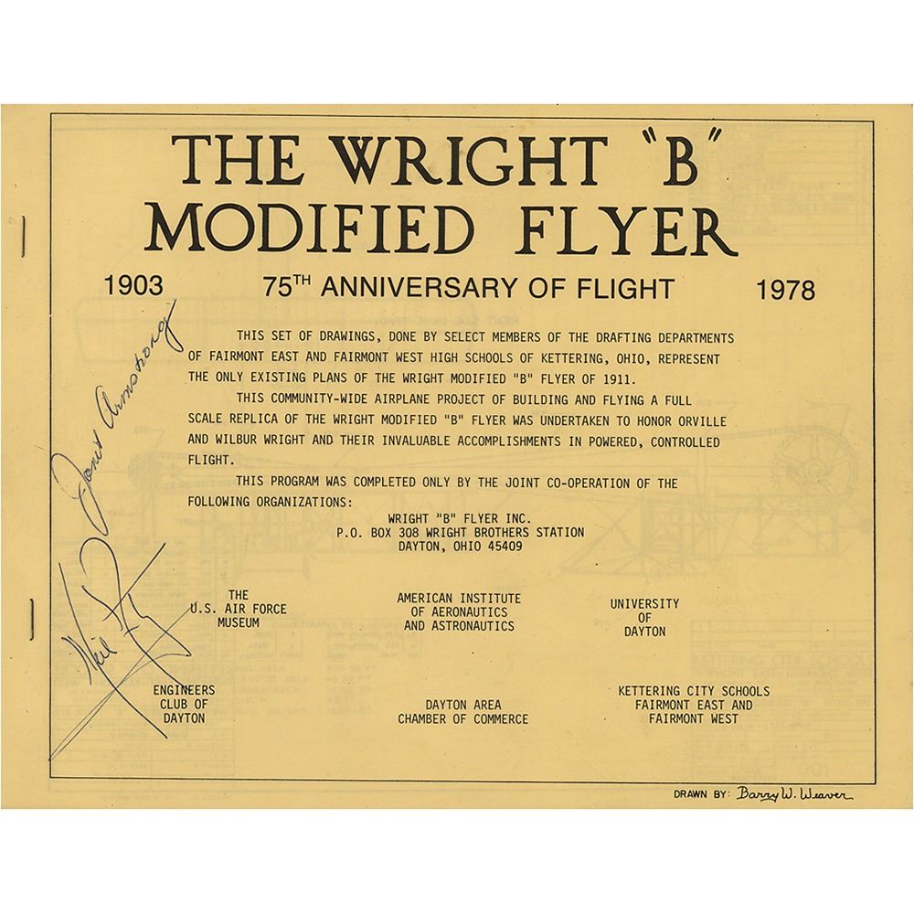 Very desirable schematics booklet entitled ‰ÛÏThe Wright ‰Û÷B‰Ûª Modified Flyer,‰Û issued during the 1978 Enshrinement Ceremonies at the Aviation Hall of Fame, which coincided with the 75th anniversary of the Wright Brothers‰Ûª historic first flight on December 17, 1903. The stapled booklet, five pages, 11 x 8.5, is signed on the front cover in black ballpoint by Apollo 11 moonwalker Neil Armstrong, and by his first wife, Janet Shearon Armstrong. A caption on the front of the booklet reads: ‰ÛÏThis set of drawings, done by select members of the Drafting Departments of Fairmont East and Fairmont West High Schools of Kettering, Ohio, represent the only existing plans of the Wright Modified ‰Û÷B‰Ûª Flyer of 1911.‰Û Includes the original 1978 Aviation Hall of Fame program and a pledge letter from Wright B. Flyer, Inc., seeking donations for the completion of ‰ÛÏa modern, flying, lookalike version of the aircraft.‰Û In fine condition. Accompanied by a full letter of authenticity from Zarelli Space Authentication.