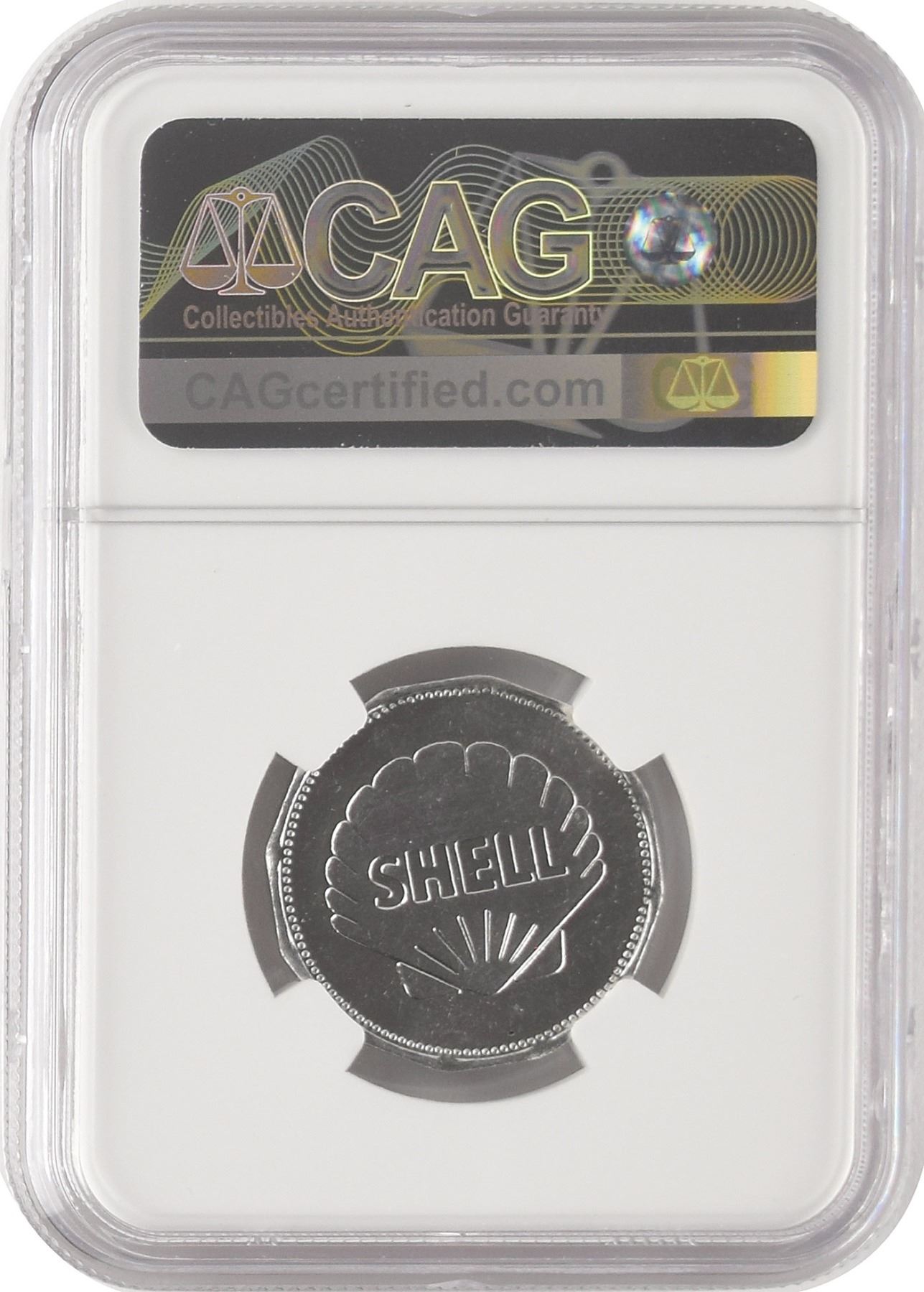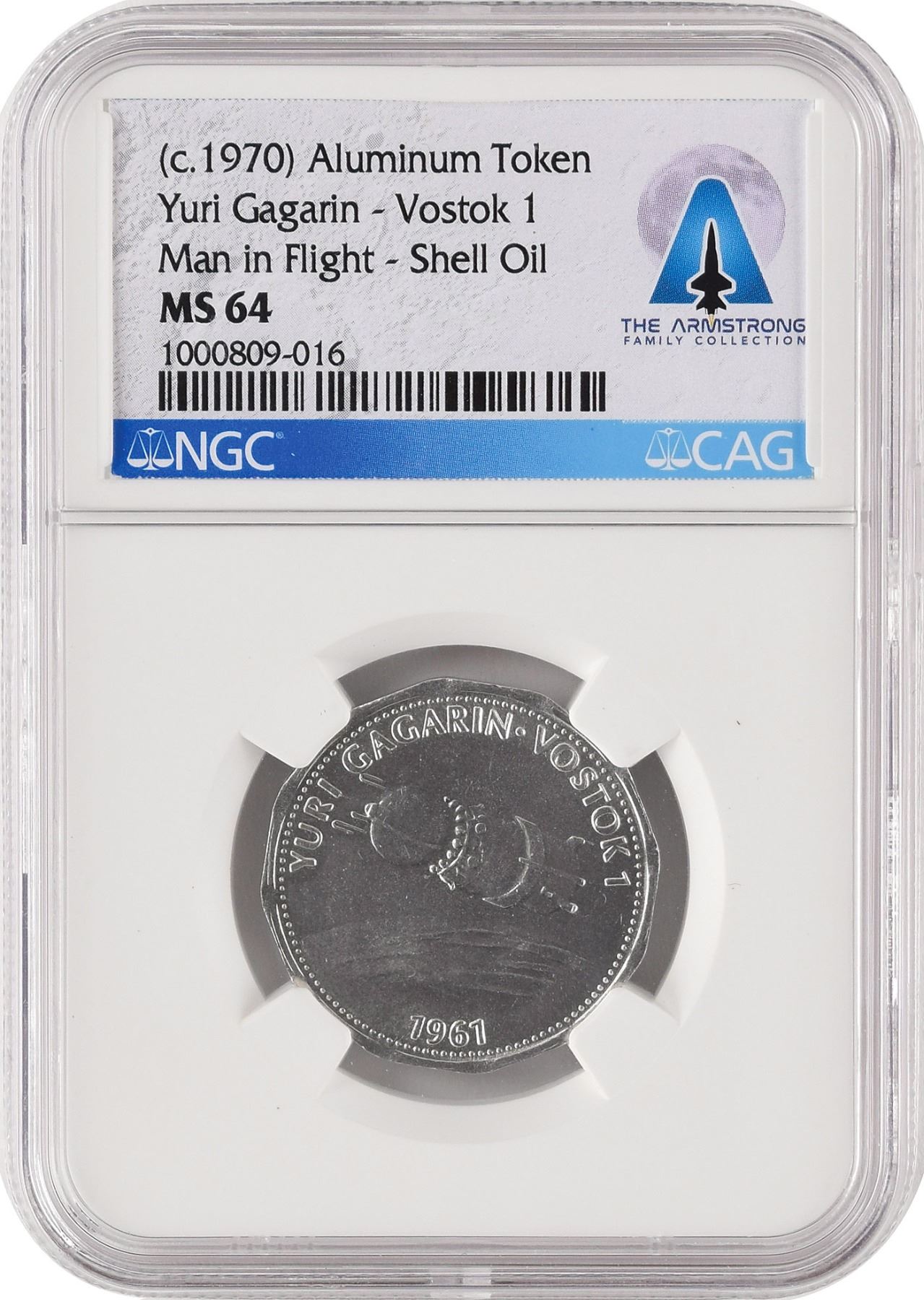 Neil Armstrong's circa 1970 Shell Oil aluminum token from the 'Man in Flight' series, honoring the 1962 flight of Yuri Gagarin on the Vostok 1 mission. The token depicts the Vostok 3KA space capsule on one side, with the Shell logo on the other. Encapsulated and graded by NGC as "MS 64," with the label featuring the Armstrong Family Collection logo. Accompanied by a letter of provenance from The Armstrong Family Collection, signed by Armstrong's sons, Rick and Mark. Provenance: Heritage Auctions, The Armstrong Family Collection, May 2019.