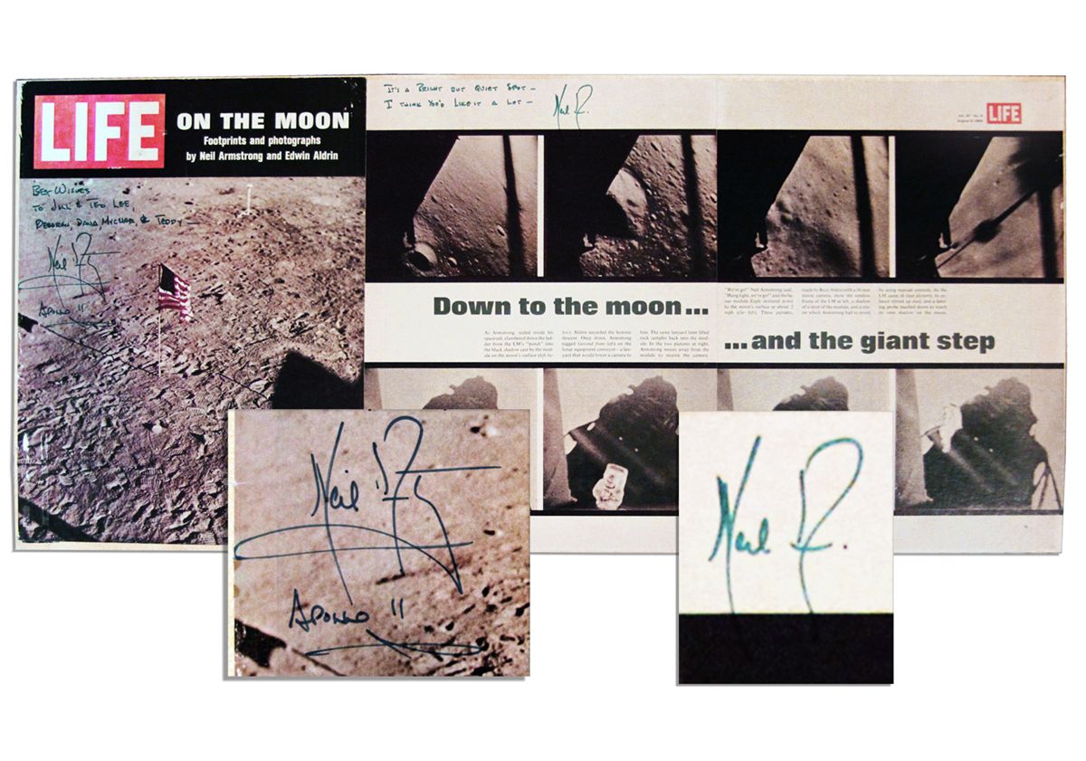 Neil Armstrong twice-signed LIFE Magazine pages. The late astronaut inscribes the cover of the 8 August 1969 issue, which features Apollo 11 as the cover story: ''Best wishes To Jill & Ted Lee / Deborah, Dana, Michael & Teddy / Neil Armstrong / Apollo 11''. He also adds his autograph inscription to the top of page 18 within. It reads in full: ''It's a bright but quiet spot - I think you'd like it a lot - Neil A''. The cover and pages 18-19 are mounted to paper board to an overall size of 30.75'' x 14''. Toning, else near fine. A rare personal commentary about the moon by Armstrong, its first visitor. With PSA/DNA COA.