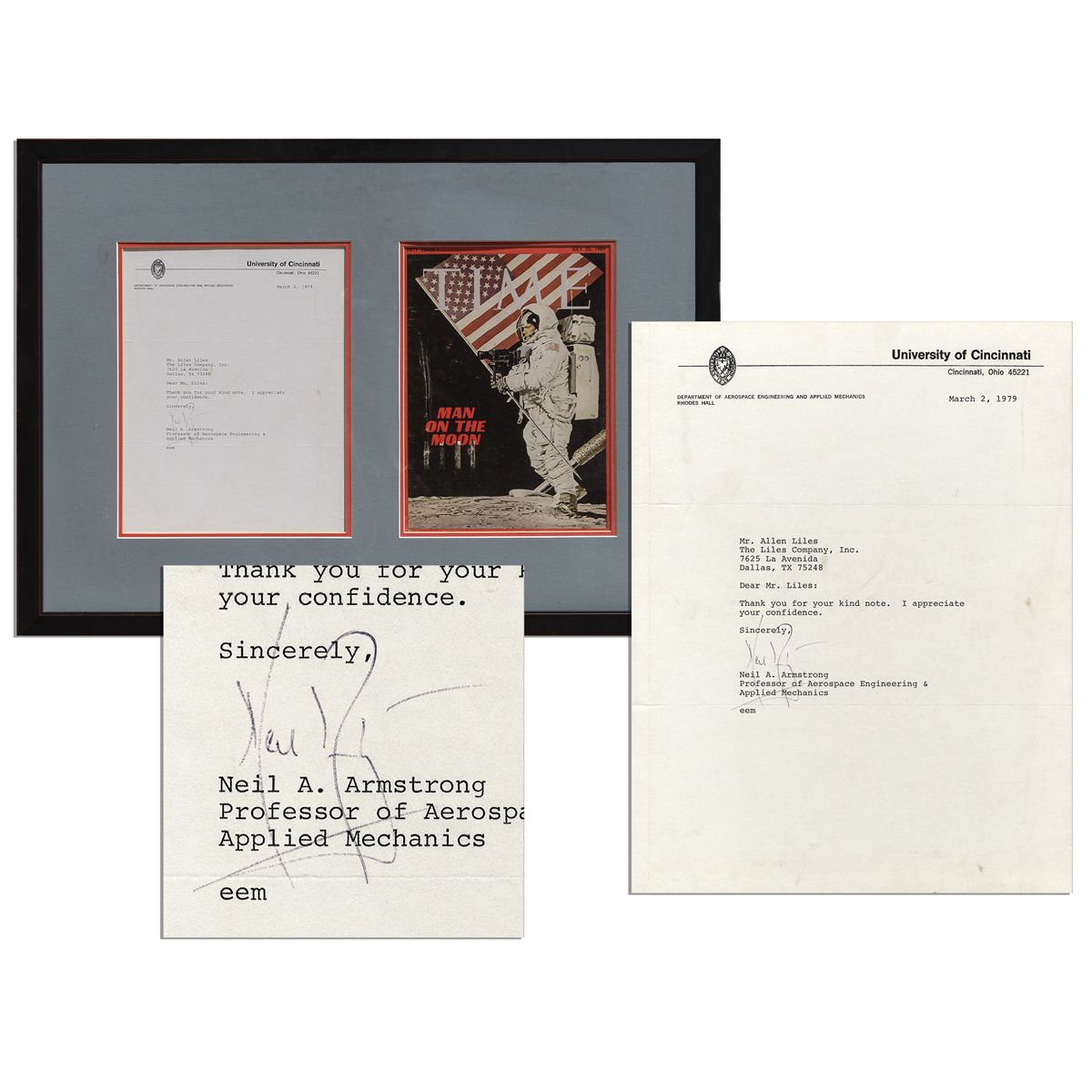 Neil Armstrong typed letter signed as Professor of Aerospace Engineering and Applied Mechanics at the University of Cincinnati. Letter dated 2 March 1979 is addressed to Mr. Allen Liles of the Liles Company Inc. Upon University of Cincinnati stationery, letter reads in full, ''Thank you for your kind note. I appreciate your confidence. [signed] Neil Armstrong''. Single-page letter is matted and framed with the 25 July 1969 cover of ''Time'' magazine featuring Neil Armstrong, ''Man on the Moon'', to an overall size of 25.25'' x 18''. Letter is mounted, else very good.