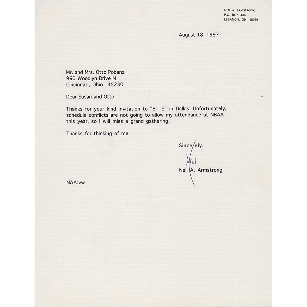 TLS signed ‰ÛÏNeil,‰Û one page, 8.5 x 11, personal letterhead, August 18, 1997. Letter to local friends Otto and Susan Pobanz, in full: "Thanks for your kind invitation to 'BTTS' in Dallas. Unfortunately, schedule conflicts are not going to allow my attendance at NBAA this year, so I will miss a grand gathering." In fine condition. Otto Pobanz was a director of the National Business Aviation Association (NBAA).
