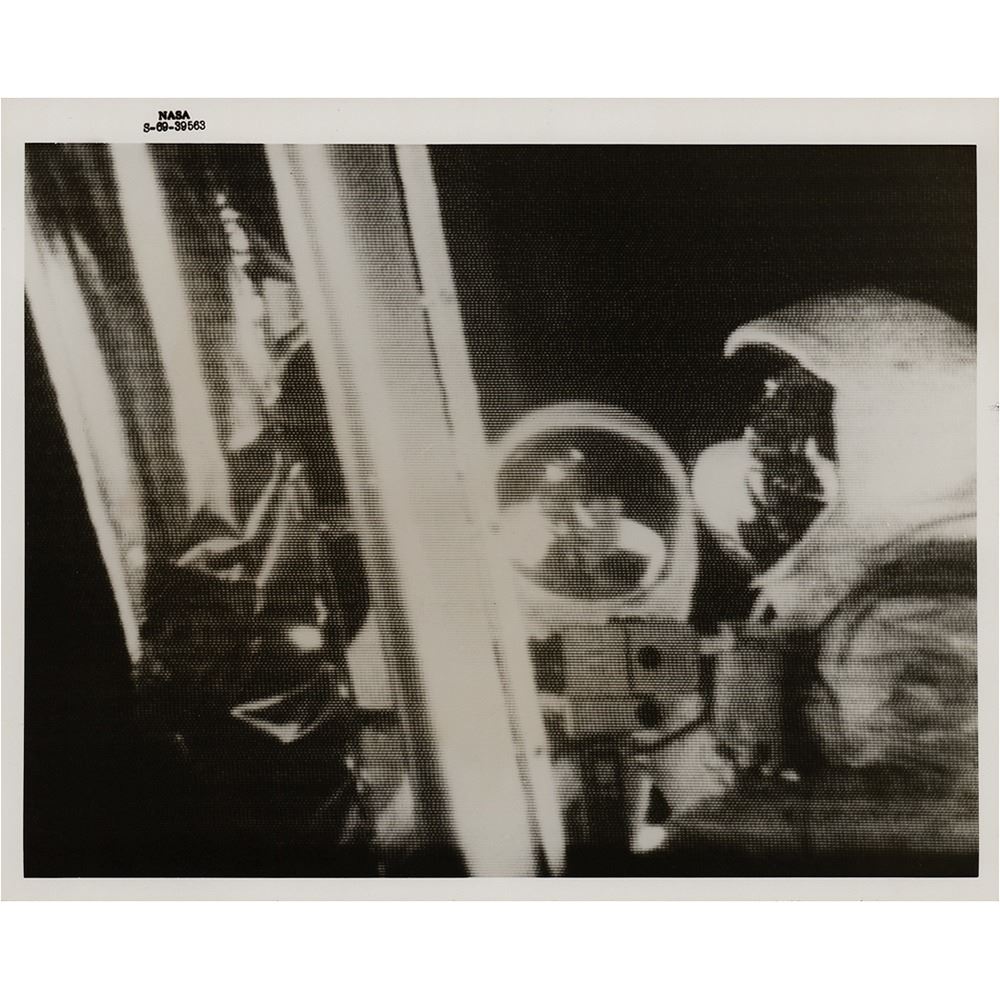 Rare official glossy 10 x 8 NASA photo (S-69-39563) of Neil Armstrong and Buzz Aldrin standing by the Lunar Module Eagle ladder, which was captured by the Apollo 11 lunar surface television camera during the mission's extravehicular activity. This picture was made from a televised image received at the Deep Space Network tracking station at Goldstone, California. In fine condition, with scattered light creasing. Originally from the collection of Victor Martin Malburet, which was displayed at 'La Lune' exhibit held at the Grand Palais in Paris, France from April to July of 2019.