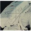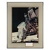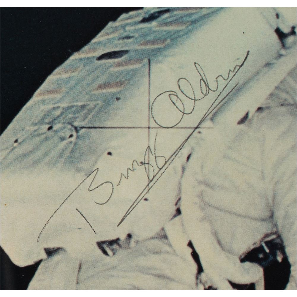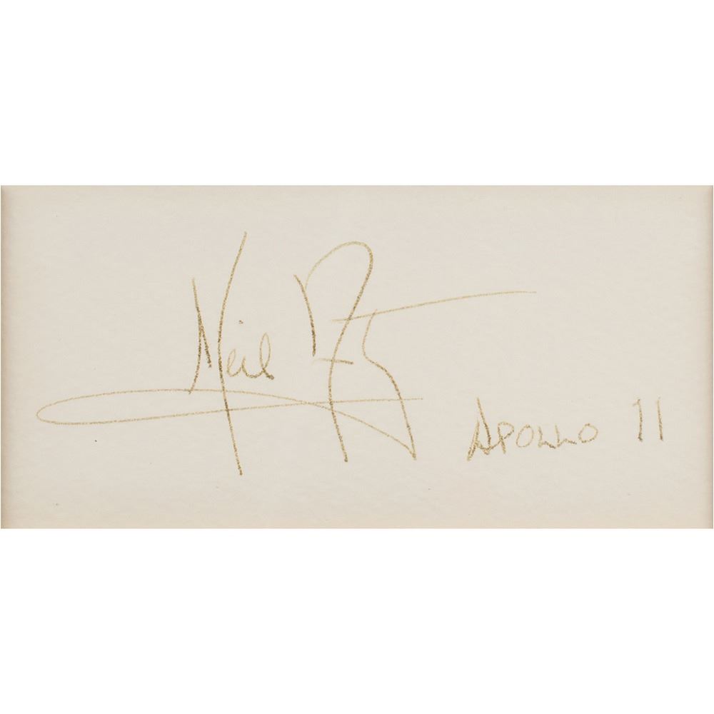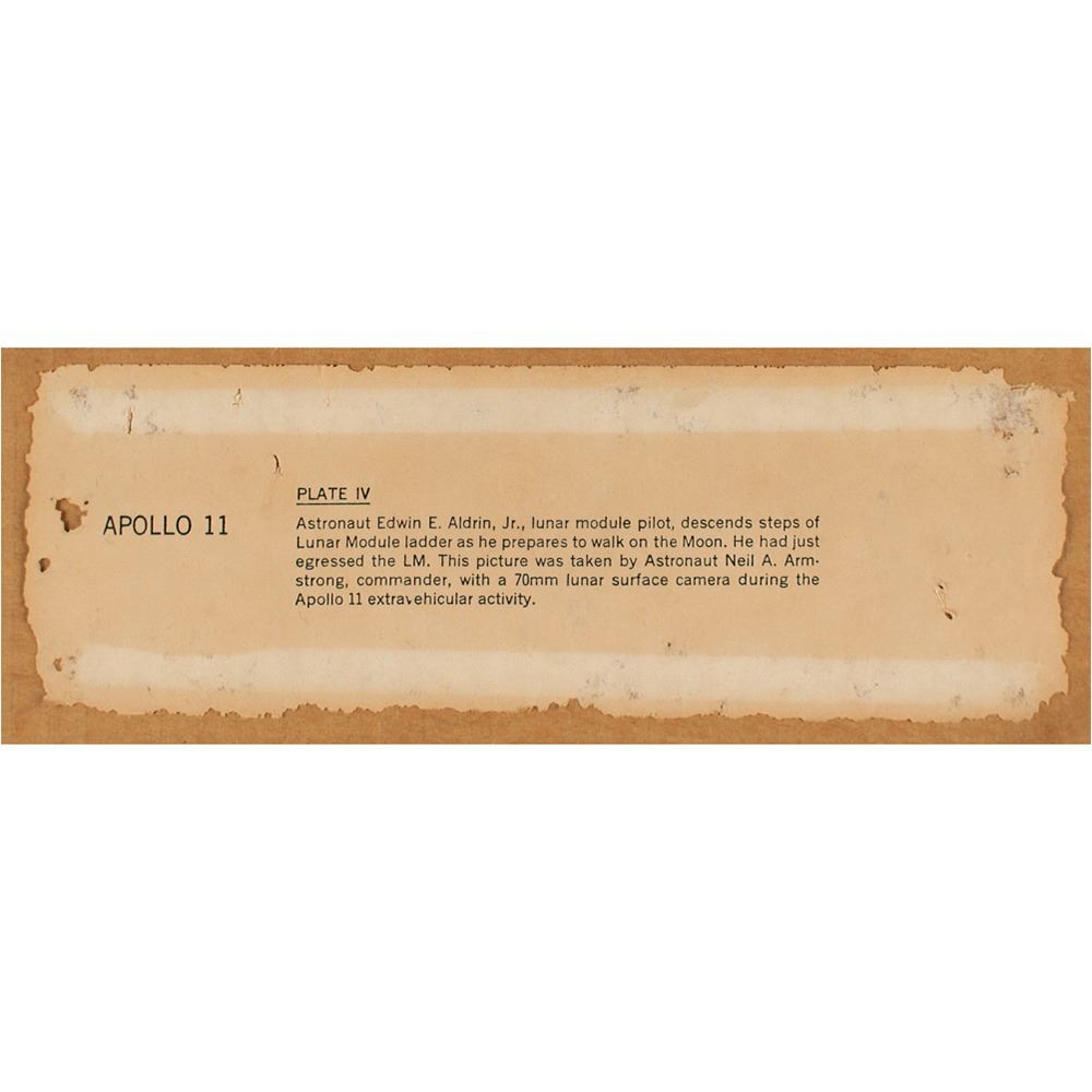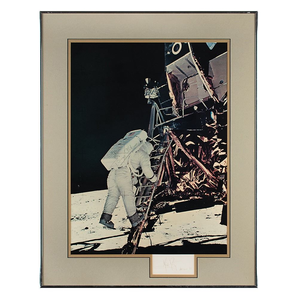 Two items: an ink signature, "Neil Armstrong, Apollo 11," on an off-white 4.25 x 2 card; and an oversized official color 15.75 x 21.5 NASA photographic print of LMP Aldrin descending the ladder of the Lunar Module Eagle, signed in black ink, "Buzz Aldrin." Double-matted and framed to an overall size of 22 x 28. In overall fine condition; framed backing bears an affixed "Apollo 11, Plate IV" caption sheet. Consignor notes that the photo derives from the collection of an early Disney / Epcot executive.