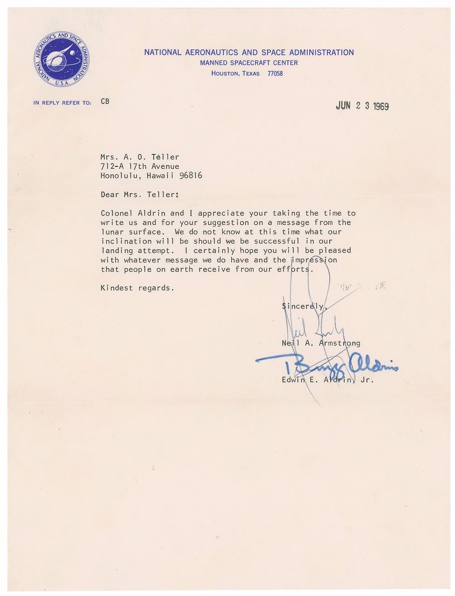 TLS, one page, 8 x 10.5, NASA letterhead, stamp-dated June 23, 1969. Letter of thanks to a woman in Honolulu, Hawaii, written just three weeks before the launch of Apollo 11. In full: “Colonel Aldrin and I appreciate your taking the time to write us for your suggestion on a message from the lunar surface. We do not know at this time what our inclination will be should we be successful in our landing attempt. I certainly hope you will be pleased with whatever message we do have and the impressions that people on earth receive from our efforts.” In fine condition, with Armstrong’s flourish lightly affecting Aldrin’s signature, and the opening stroke of another Armstrong signature, inadvertently started in Aldrin’s space. Accompanied by a printed Apollo 11 mission information sheet from NASA, as well as the original mailing envelope, and a couple of news clippings mentioning Armstrong’s and Aldrin’s moonwalks and possible statements when touching the lunar surface.