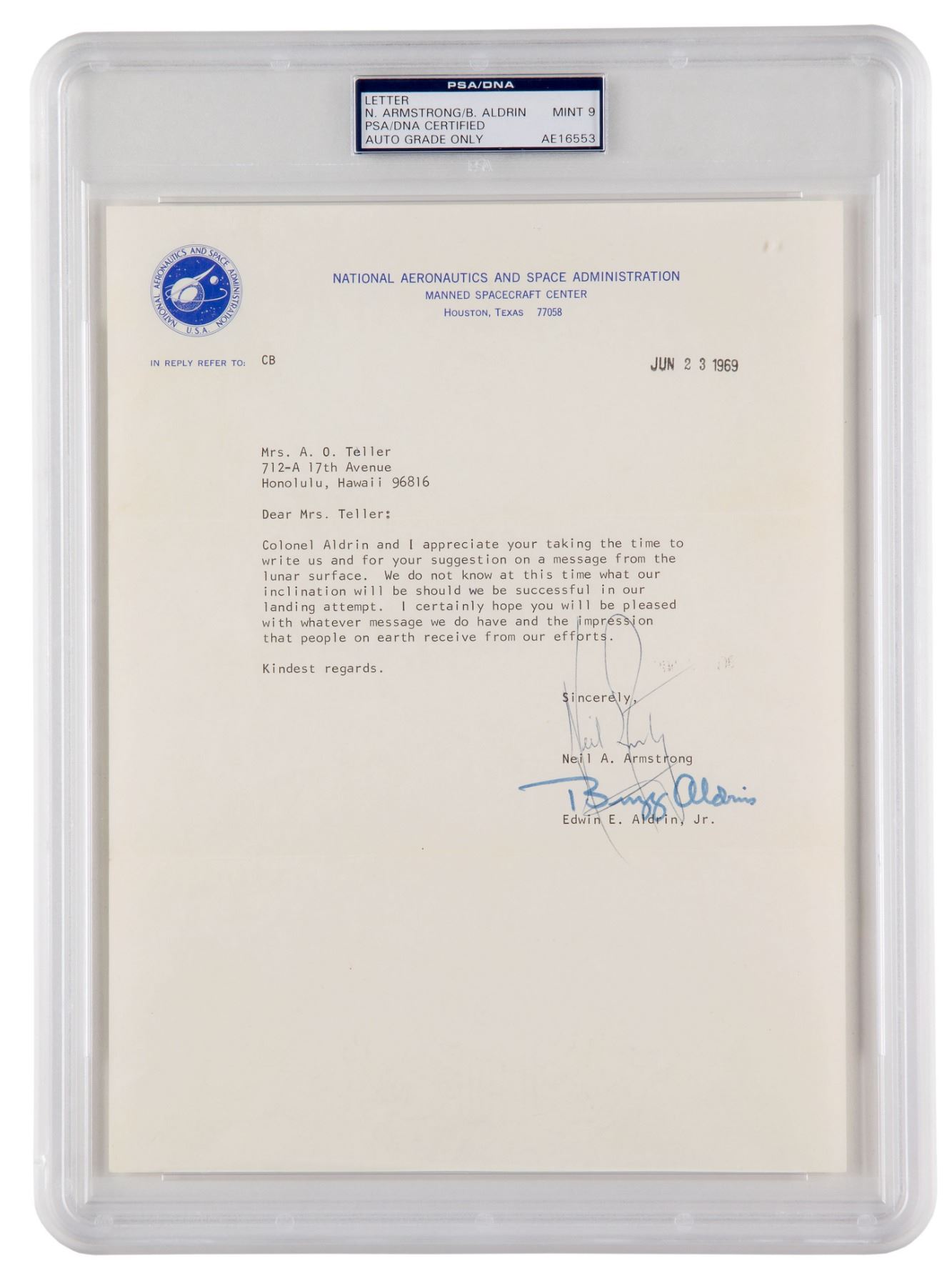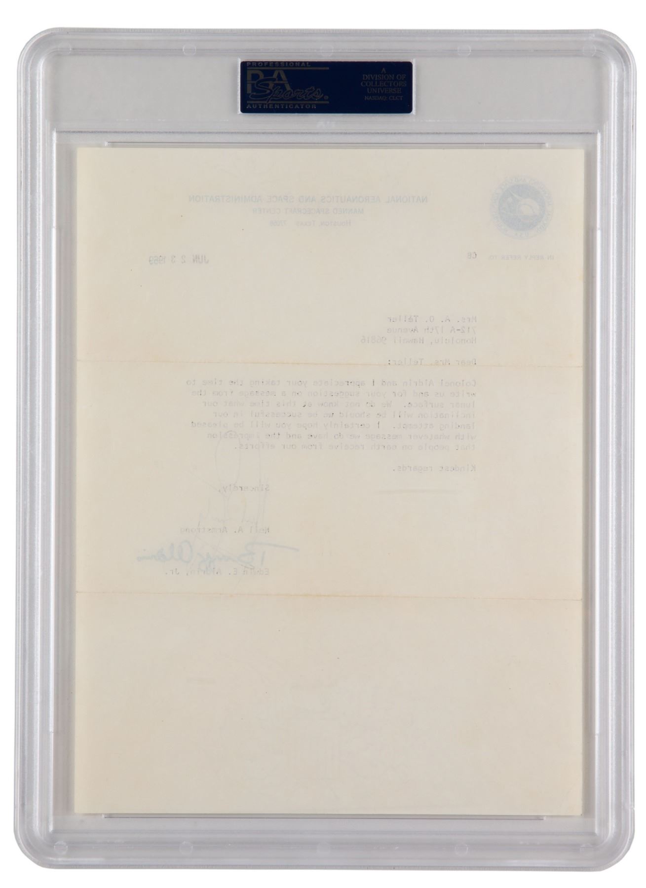 TLS, one page, 8 x 10.5, NASA letterhead, stamp-dated June 23, 1969. Letter of thanks to a woman in Honolulu, Hawaii, written just three weeks before the launch of Apollo 11. In full: "Colonel Aldrin and I appreciate your taking the time to write us for your suggestion on a message from the lunar surface. We do not know at this time what our inclination will be should we be successful in our landing attempt. I certainly hope you will be pleased with whatever message we do have and the impressions that people on earth receive from our efforts." Encapsulated in a plastic PSA/DNA authentication holder, evaluating the autographs as "MINT 9." In fine condition, with Armstrong's flourish lightly affecting Aldrin's signature, and the opening stroke of another Armstrong signature, inadvertently started in Aldrin's space. Accompanied by a printed Apollo 11 mission information sheet from NASA, as well as the original mailing envelope, and a couple of news clippings mentioning Armstrong's and Aldrin's moonwalks and possible statements when touching the lunar surface.