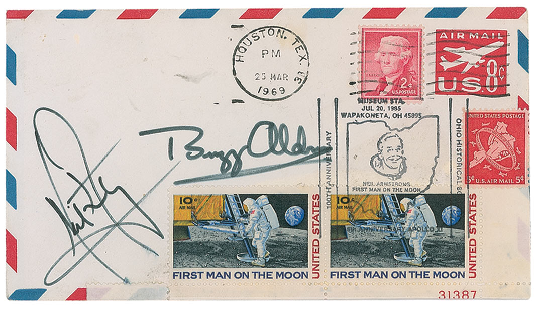 Unusual air mail envelope, 6.5 x 3.75, bearing a March 25, 1969, Houston, Texas cancellation, as well as a July 20, 1985, Wapakoneta, Ohio, Neil Armstrong commemorative cancellation, signed on the front in black felt tip by Neil Armstrong and Buzz Aldrin. In fine condition, with some scattered light toning, mainly to lower right corner.
