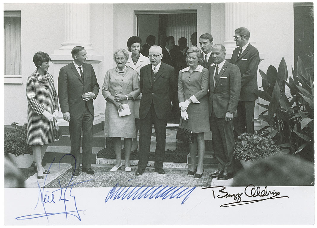 Unique 7 x 5 cardstock photo of Apollo 11 astronauts Neil Armstrong and Buzz Aldrin meeting with German President Gustave Heinemann, signed in blue ballpoint by Armstrong and black felt tip by Aldrin. Also signed in blue ballpoint by Heinemann. In fine condition with a few specks of surface chipping to the extreme right edge.