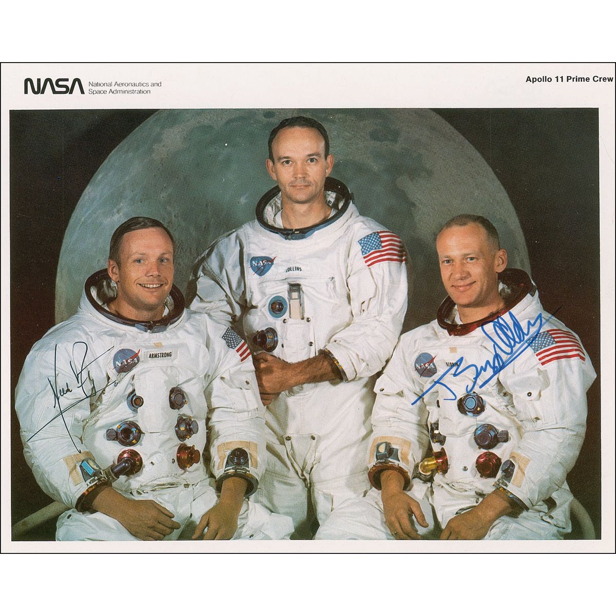Color 8 x 10 NASA photo, signed in black felt tip, “Neil Armstrong” and in blue felt tip, “Buzz Aldrin.” In fine condition. Accompanied by four color candid photos taken at the event including Armstrong and Aldrin signing in on a guest book and a photo of Armstrong turning back to wave at Aldrin, and a newspaper clipping from the event. The original recipient was a Johnson Space Center employee who obtained the first two moonwalkers’ signatures at the Apollo 11 20th anniversary gala.