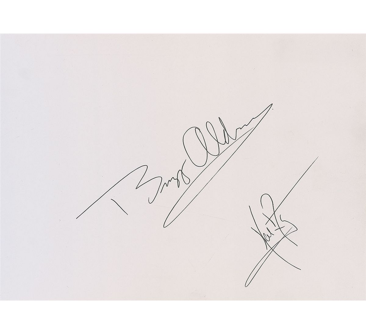Ink signatures, “Neil Armstrong,” and “Buzz Aldrin,” on a 10.25 x 7.5 off-white acid-free sheet. In very fine condition. Consignor indicates that the signatures were obtained at the NASA Glenn Research Center on July 13, 1989, a week before the 20th anniversary of their mission.