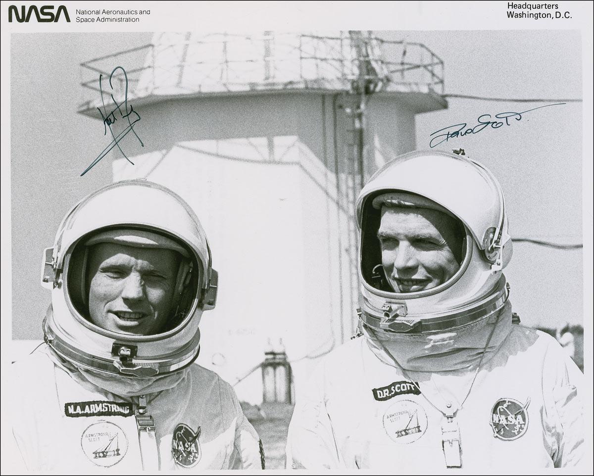 Vintage glossy 10 x 8 NASA photo of the Gemini 8 crew in their spacesuits during a press conference at Cape Kennedy in 1966, signed in black felt tip, “Neil Armstrong” and “Dave Scott.” The original caption information is typed on the reverse. In fine condition. A relaxed image of the Gemini crew.