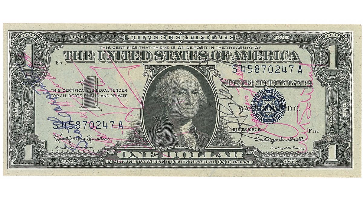 Uncommon Series 1957 B one dollar silver certificate signed on the portrait side in red and blue ballpoint by Neil Armstrong, Ed White, Scott Carpenter, John Glenn, James Lovell, and Wally Schirra, and signed again on the reverse in ballpoint by Neil Armstrong and Deke Slayton. Signatures were obtained while the astronauts were participating in jungle training in Panama from June 3-6, 1963, at Albrook Air Force Base. In fine condition, with some light contrast to Armstrong’s and Slayton’s signatures on reverse. Although missions were meant to land in the ocean, NASA took no chances and provided the astronauts with jungle and desert training in case of going off course. A very scarce assemblage of signatures acquired during a very important, and fortunately not called upon, part of their training.