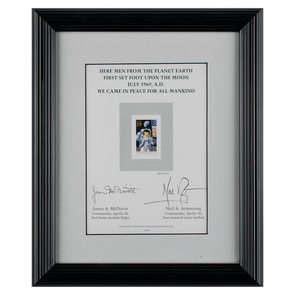 Uncommon limited edition philatelic souvenir presentation certificate, numbered 124/154, signed in pencil by Jim McDivitt and Neil Armstrong. The certificate bears a commemorative postage stamp affixed to the center, headed with the text: "Here men from the planet Earth first set foot upon the moon, July 1969, A. D., We came in peace for all mankind." Small print at the bottom reads: "Presented to our fellow Conquistadores del Cielo, 1994." Matted and framed to an overall size of 9.75 x 11.75. In very fine condition. Armstrong and McDivitt were both members of the Conquistadores del Cielo, an elite aviation club.