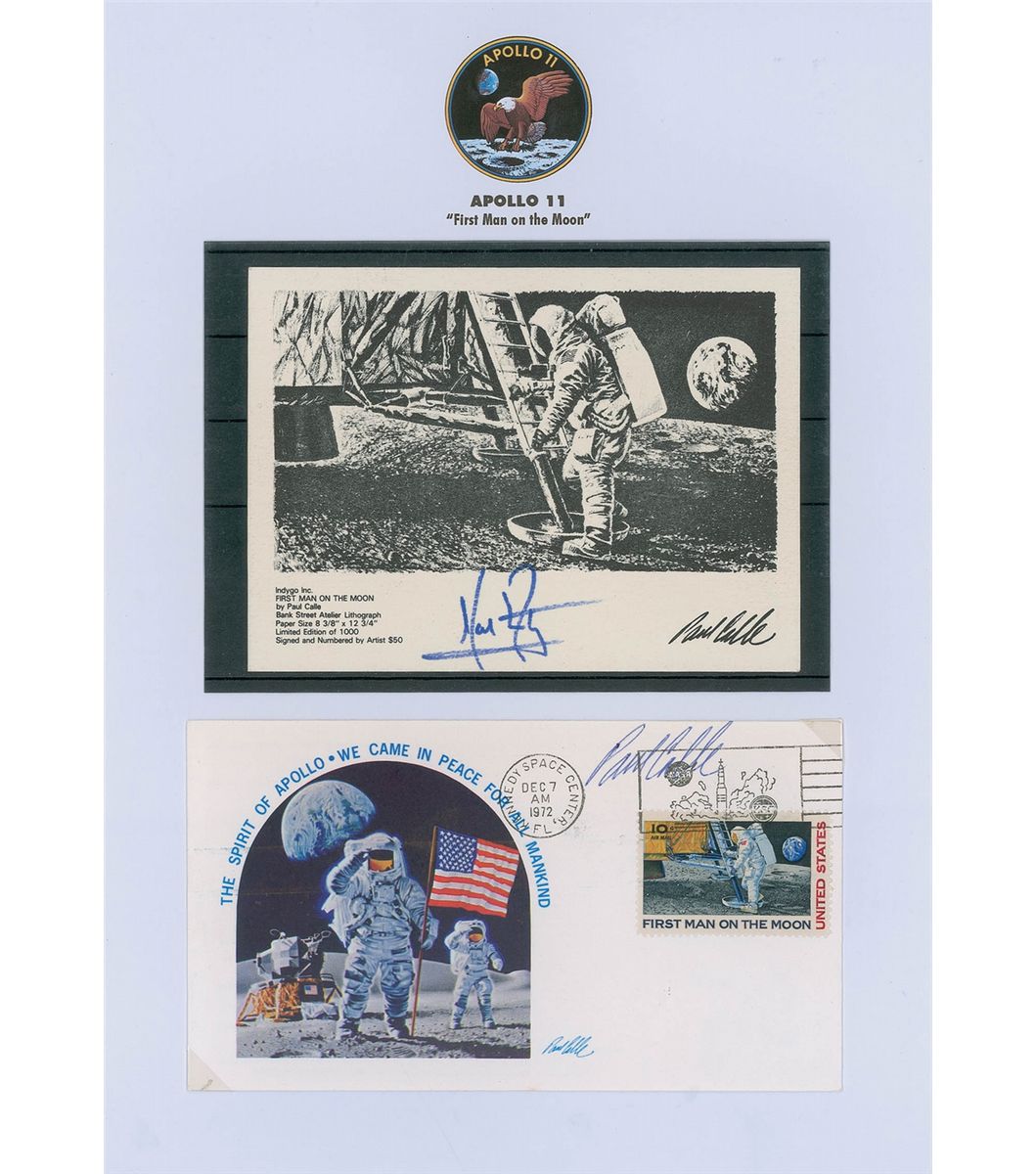 Postcard-size print of Calle’s First Man on the Moon, 5.5 x 4, signed in the lower border in blue felt tip by Neil Armstrong and also bearing a printed Calle signature; and a commemorative cover bearing a color Calle-designed cachet honoring the Apollo astronauts, signed at the top in blue ballpoint by Calle. In fine condition. An excellent, and uncommon, example of one of the most popular USPS stamps ever issued.