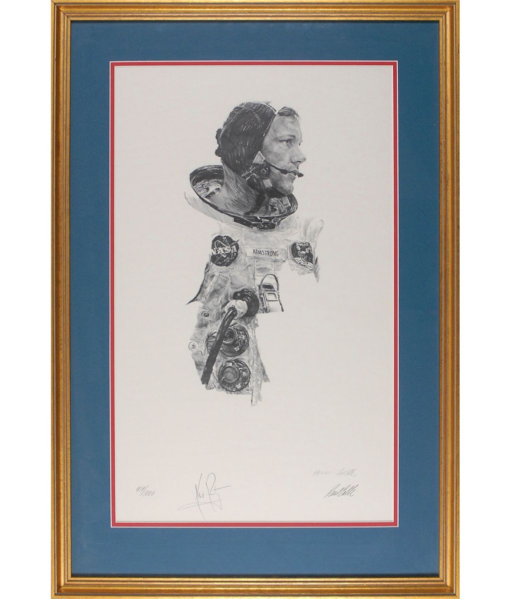 Limited edition 14 x 23 lithograph of Armstrong in his flight suit prior to the Apollo 11 mission, numbered 914/1000, signed in pencil by Armstrong at the National Air and Space Museum in 1976. Also signed in pencil by the artist, Paul Calle, beneath his pre-printed signature. Double-matted and framed to an overall size of 20.5 x 30. Affixed to the reverse of the frame is the rare printed description picturing an image of Armstrong captioned, “Paul Calle and Neil Armstrong signed the prints at the National Air and Space Museum on December 23, 1976.” In fine condition. A highly sought after item as this is the only individual print edition that Armstrong signed.