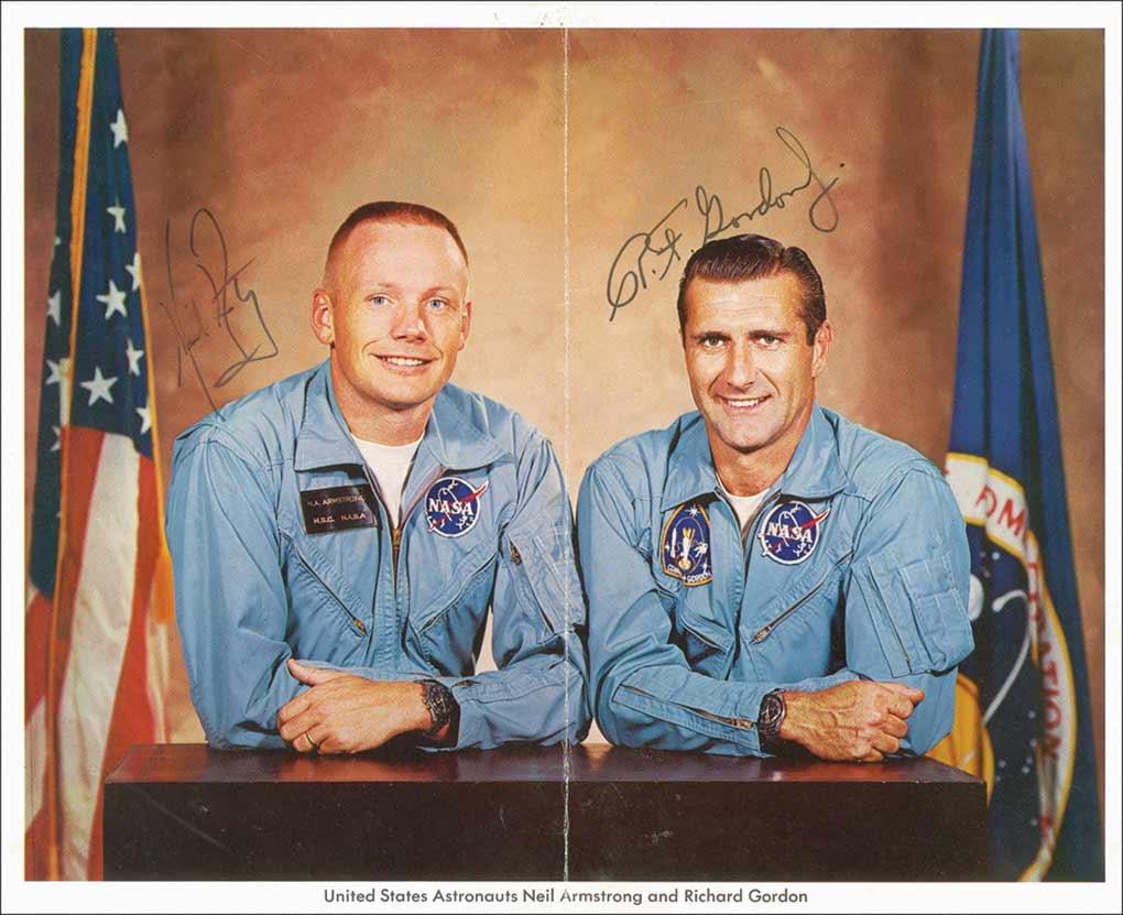 Color 10 x 8 NASA photo of Gemini 11 pilot Gordon and back-up command pilot Armstrong posing in their blue flight suits, signed in black felt tip, “Neil Armstrong,” and “R. F. Gordon, Jr.” In very good condition, with moderate bisecting vertical fold, and a few scattered light creases and surface marks. A rare pairing of these Gemini, and soon to be Apollo astronauts.