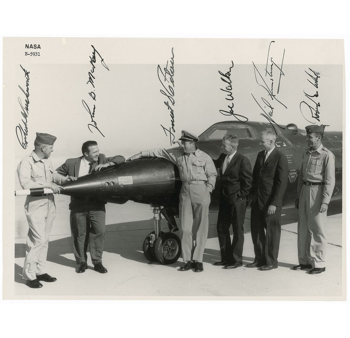 Vintage glossy 9 x 7 NASA photo taken on October 5, 1960 and numbered E-5931, of Armstrong and five others posing in front of one of their jets, signed vertically in fountain pen by Neil Armstrong, Robert Rushworth, Forrest Petersen, Joe Walker, Robert White, and John McKay. In very good condition, with trimmed edges, and scattered light bends and rippling. Accompanied by the address panel of the original mailing envelope. Operational from 1959 to 1968, the X-15 program was the direct forerunner of orbital spacecraft. As such, the data gathered on these flights was crucial to the development of America’s space program. Numerous records—official and unofficial—were set during the course of the X-15 program, including an altitude record (354,200 feet) achieved by Walker, a NASA pilot, in 1963. Armstrong, of course, would become the best-remembered of the group for his role in history as the first man on the moon.