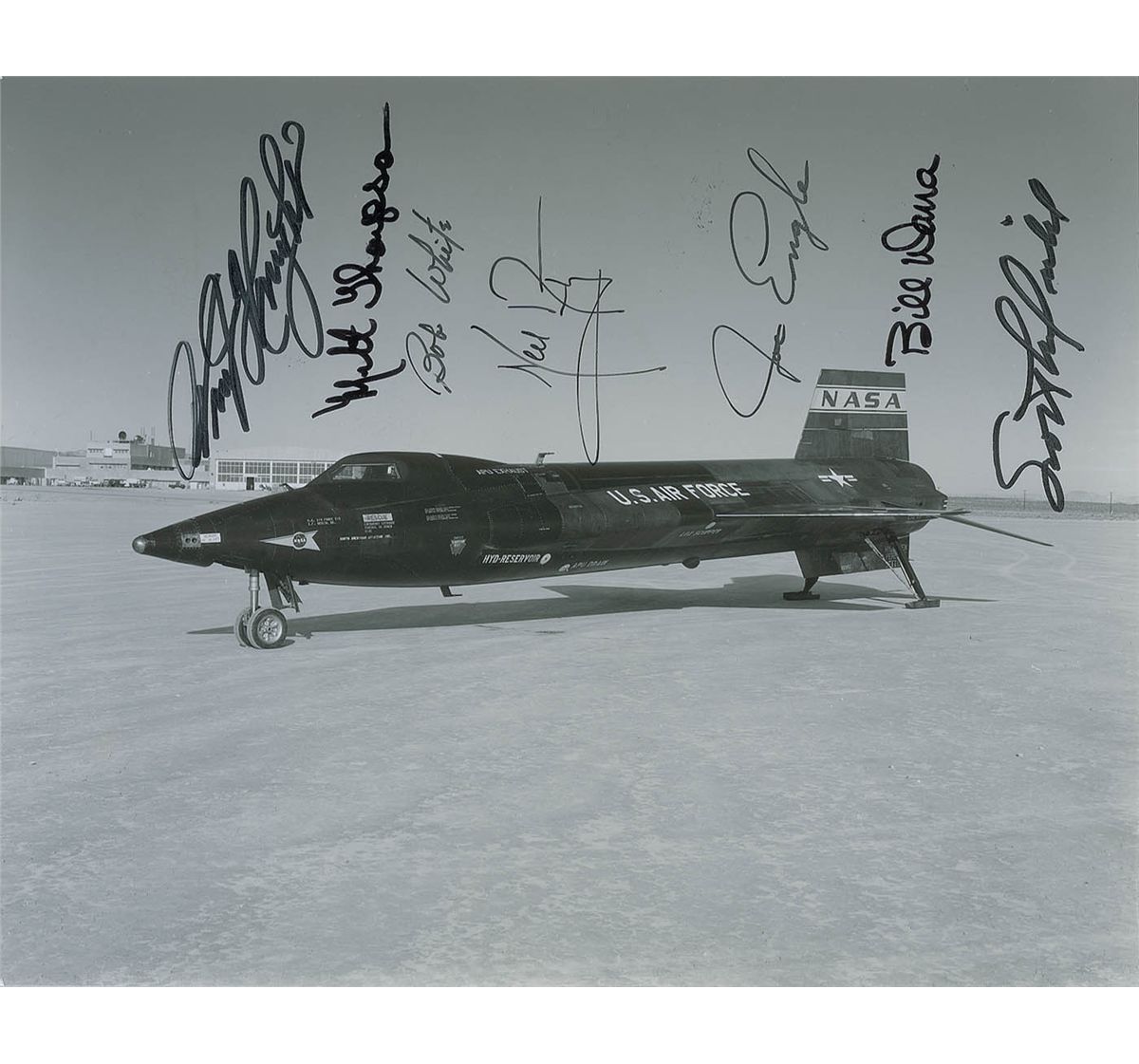 Satin-finish 10 x 8 photo of an X-15 aircraft on the tarmac, signed vertically in black felt tip by Neil Armstrong and pilots Milt Thompson, Bob White, Joe Engle, Bill Dana, Scott Crossfield, and Pete Knight. In fine condition.