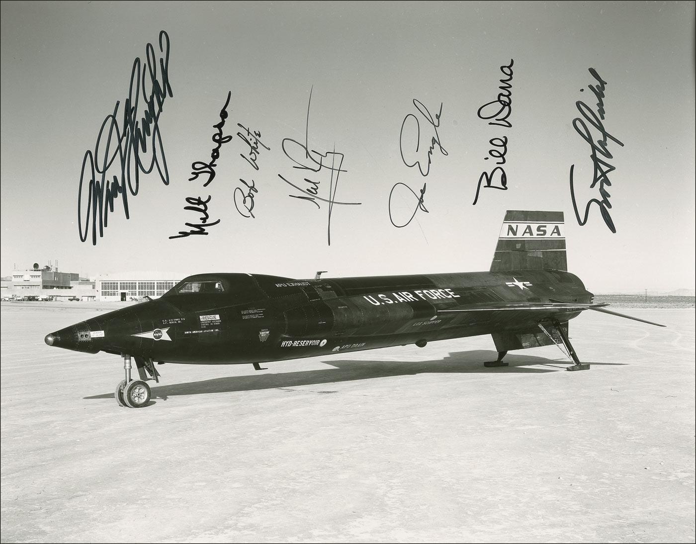Twelve pilots were chosen for the X-15 rocket-powered aircraft test program: five from NASA, five from the Air Force, one from the Navy, and one from manufacturer North American Aviation. North American (and former NASA) test pilot Scott Crossfield made the first unpowered flight on June 8, 1959; William Dana piloted the final flight on October 24, 1968. In the course of the program, the X-15 set an unofficial world speed record of 4,520 mph (Mach 6.7) in a flight by Air Force pilot Pete Knight on October 3, 1967. The altitude record (354,200 feet) was set by NASA pilot Joseph Walker on August 22, 1963. Satin-finish 14 x 11 limited-edition signed photo of an X-15 on the tarmac, signed in black felt tip by Armstrong and six other X-15 pilots. This item is one of the very special limited-edition photographs that Neil Armstrong signed for the Edwards A. F. B. Flight-Test Historical Society. Signers are: William Knight (1929–2004), Milt Thompson (b. 1926), Bob White (b. 1924), Neil Armstrong (b. 1930), Joe Engle (b. 1932), Bill Dana (b. 1930), and Scott Crossfield (1921–2006). In very fine condition. Pre-certified Scott Cornish and RRAuction COA.