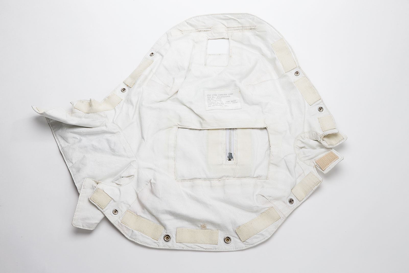 The A7L suit consisted of an inner Pressure Garment Assembly (PGA) that was pressurized with oxygen for breathing, and an outer Integrated Thermal Micrometeoroid Garment (I/TMG) that protected the astronaut from temperature extremes and hypervelocity micrometeoroid punctures while on the lunar surface. Connectors for the primary and back-up oxygen supply, electrical supply, and water for space suit cooling were on the front torso area of the A7L suit. The connector cover was intended to protect these connections during training exercises, to prevent lunar dust from gathering around and jamming the connectors, and to provide thermal protection of the connectors. However, during training exercises, the astronauts found the cover difficult to don while wearing EVA gloves, and feared that it could interfere with the use of the Buddy Secondary Life Support System (BSLSS) in the event of an emergency. After testing found that heat dissipation without the cover fell into an acceptable range, NASA decided to delete the requirement for the I/TMG connector cover. As an A7L space suit component fitted for Neil Armstrong and likely used during training for the first lunar landing, this is an extraordinary piece of Apollo history.