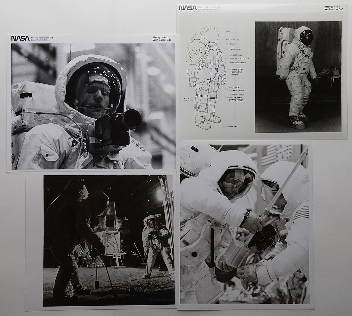 Neil Armstrong's A7L space suit I/TMG connector cover, presumably used during training for the Apollo 11 mission, measuring approximately 24? x 21?, featuring an ILC tag on the interior, reading: "Item I/TMG Connector Cover, Part No. A7L-201109-01, Size Armstrong, Serial No. 063, Date 12/68, Contract No. NAS 9-6100 (NASA), ILC Industries, Inc." The edges are lined with metal snap buttons and Velcro swatches for securing the cover against the front of the Apollo A7L space suit. Constructed of white Beta cloth, the front of the cover features a purge valve access flap secured by Velcro. Two curved side openings allow oxygen hoses to slide under the cover. In fine condition. Accompanied by three black-and-white glossy official NASA photographs showing Armstrong and Aldrin wearing this type of cover during training, an official NASA photo featuring a diagram of the suit, and a color reprint of Armstrong during training. Also includes a detailed document prepared by KSC Extravehicular Crew Training Engineer Dan Schaiewitz, explaining why NASA decided not to use the I/TMG connector cover on the Apollo missions. It is worth noting that Armstrong’s TMG flown on the Apollo 11 mission also had the serial number “063” (see: Spacesuits: The Smithsonian National Air and Space Museum Collection by Amanda Young, p. 149).