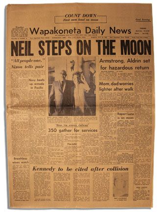 Astronaut Neil Armstrong's Ohio hometown newspaper detailing his successful moonwalk. ''Wapakoneta Daily News'' issue dated 21 July 1969 exclaims ''Neil Steps on the Moon'' in large black type. Front page includes six articles related to the Apollo 11 mission, including a photograph of Armstrong's parents. Interestingly, front page also includes mention of Edward Kennedy's ''Chappaquiddick incident.'' 10-page paper, measuring 16'' x 22.5'', has slight edge wear and some toning, with expected newspaper fold. Very good condition.