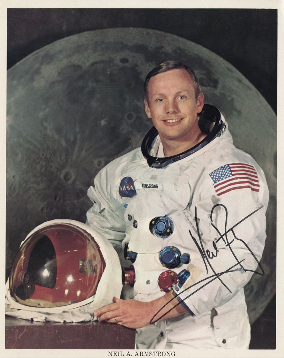 Vintage original NASA-produced colour print of astronaut Armstrong in his spacesuit against a backdrop of the lunar surface. 10x8 inches.