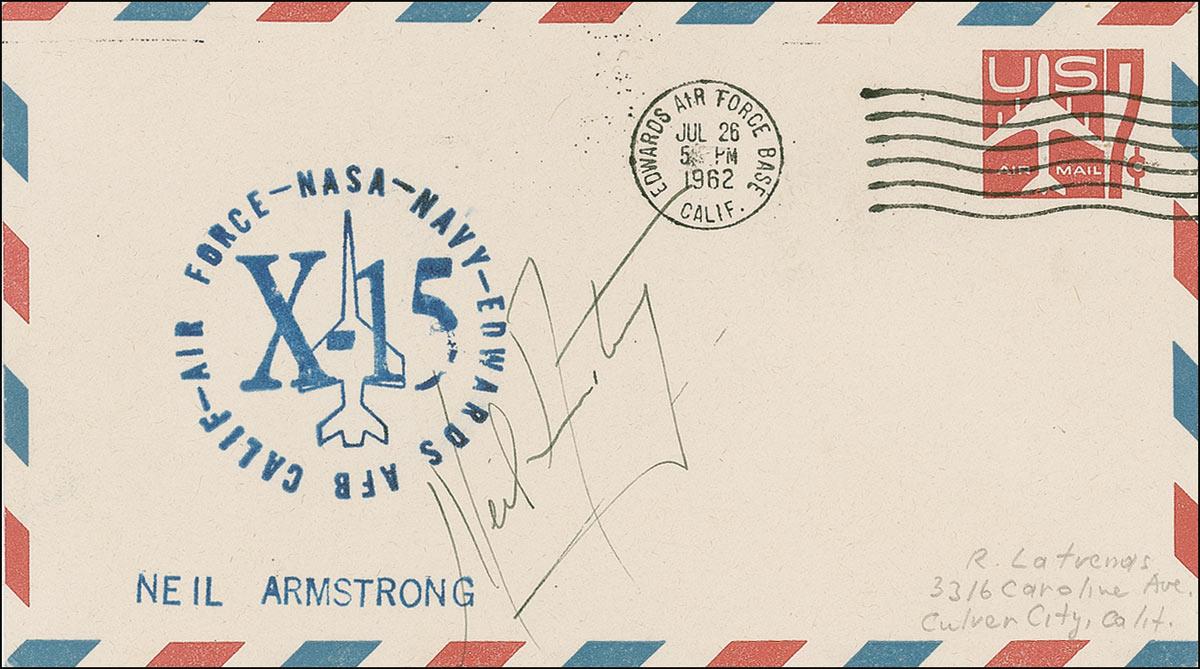 Rare vintage commemorative cover with a stamped cachet honoring the X-15 program, signed in black ink by Armstrong circa 1962. Cover also bears a July 26, 1962, Edwards Air Force Base postmark, the date of Armstrong’s X-15 flight. In fine condition, with a couple light bends and a small pencil address in another hand to lower right. On this flight, Armstrong’s speed reached 3989 mph. An early memento from a pilot who went on to much bigger things.