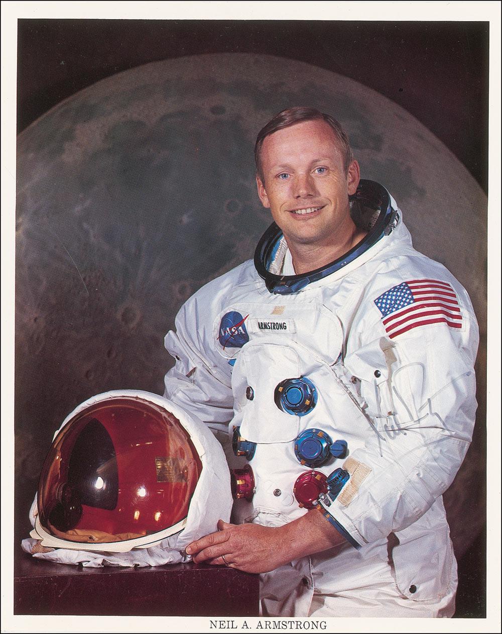 Color 8 x 10 NASA photo of Armstrong posing in his white spacesuit against a lunar background, signed in black felt tip. Armstrong’s signature light, but still completely legible, otherwise fine condition.
