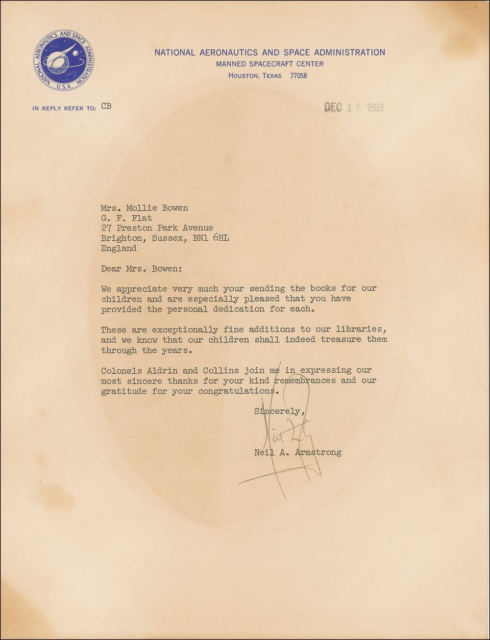 TLS, one page, 8 x 10.25, NASA letterhead, stamp-dated December 12, 1969. Letter of thanks to a woman in England. In part: “We appreciate very much your sending the books for our children and are pleased that you have provided the personal dedication for each…our children shall indeed treasure them through the years. Colonels Aldrin and Collins join me in expressing our most sincere thanks for your kind remembrances and our gratitude for your congratulations.” In very good condition, with oval area of toning over text and signature from previous display, and several other areas of light toning. Accompanied by the original mailing envelope. According to the consignor, this letter of thanks was to the author of a book published in England to coincide with the Apollo 11 space flight.