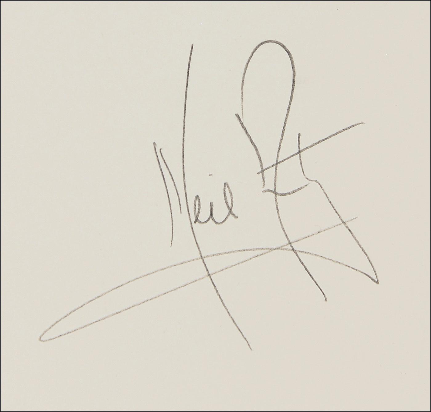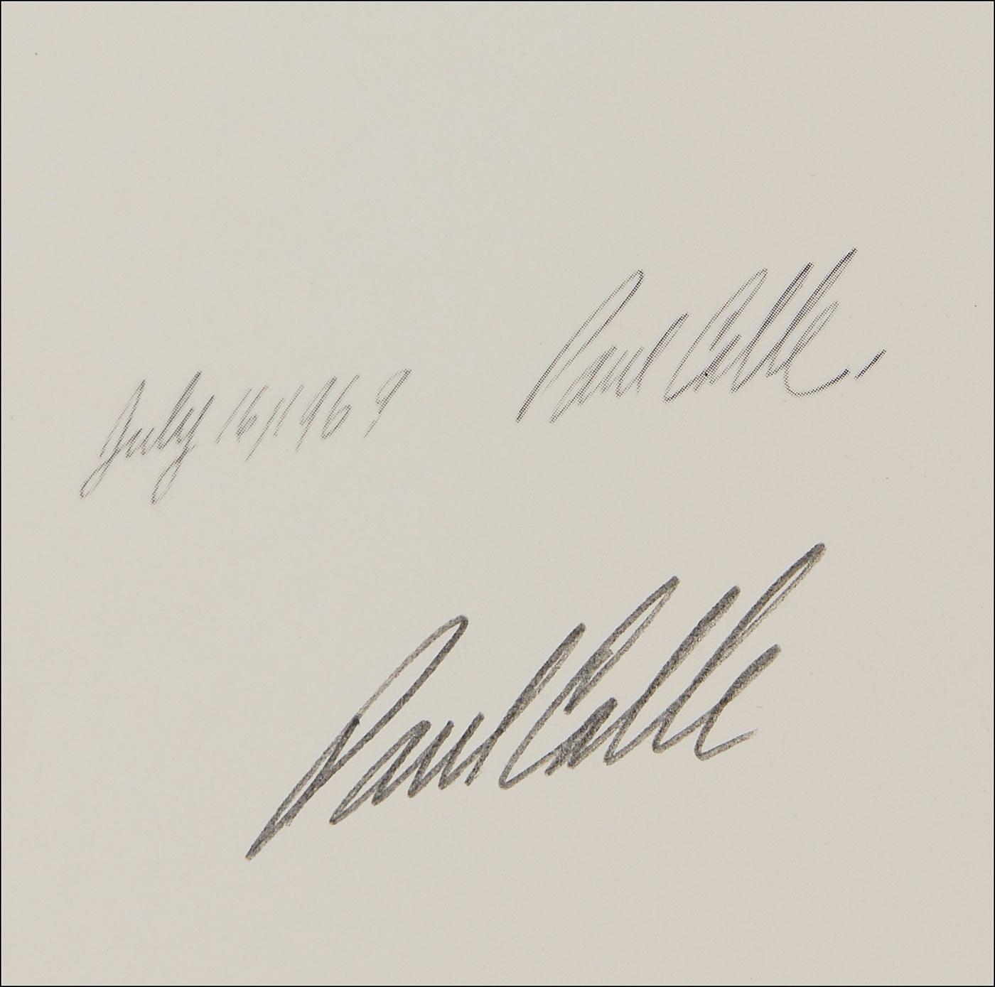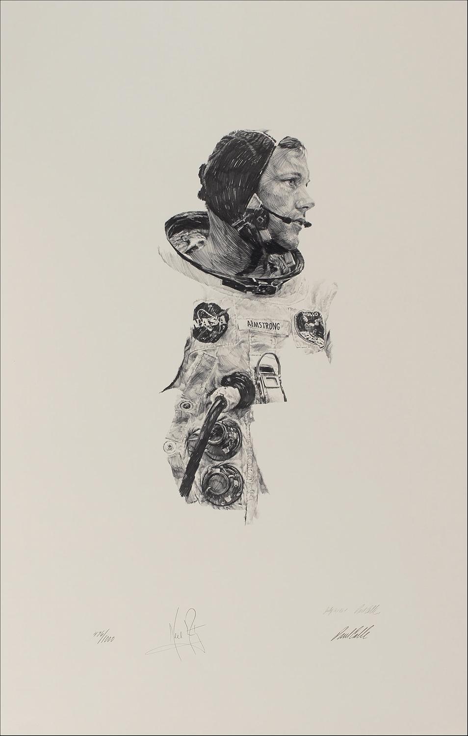 Limited edition 19 x 29 lithograph of Armstrong in his flight suit prior to the Apollo 11 mission, numbered #476/1000, signed in pencil at the National Air and Space Museum in 1976. Also signed in pencil by the artist, Paul Calle, beneath his pre-printed signature. Accompanied by the rare original 19” x 29” presentation folder imprinted “Neil Armstrong by Paul Calle” and “National Air and Space Museum for the Charles A. Lindbergh Memorial Fund.” Also present is the rare 19” x 10” printed description picturing a photograph captioned “Paul Calle and Neil Armstrong sign the prints at the National Air and Space Museum on December 23, 1976.” A desirable item as this is the only individual print edition that Armstrong signed.