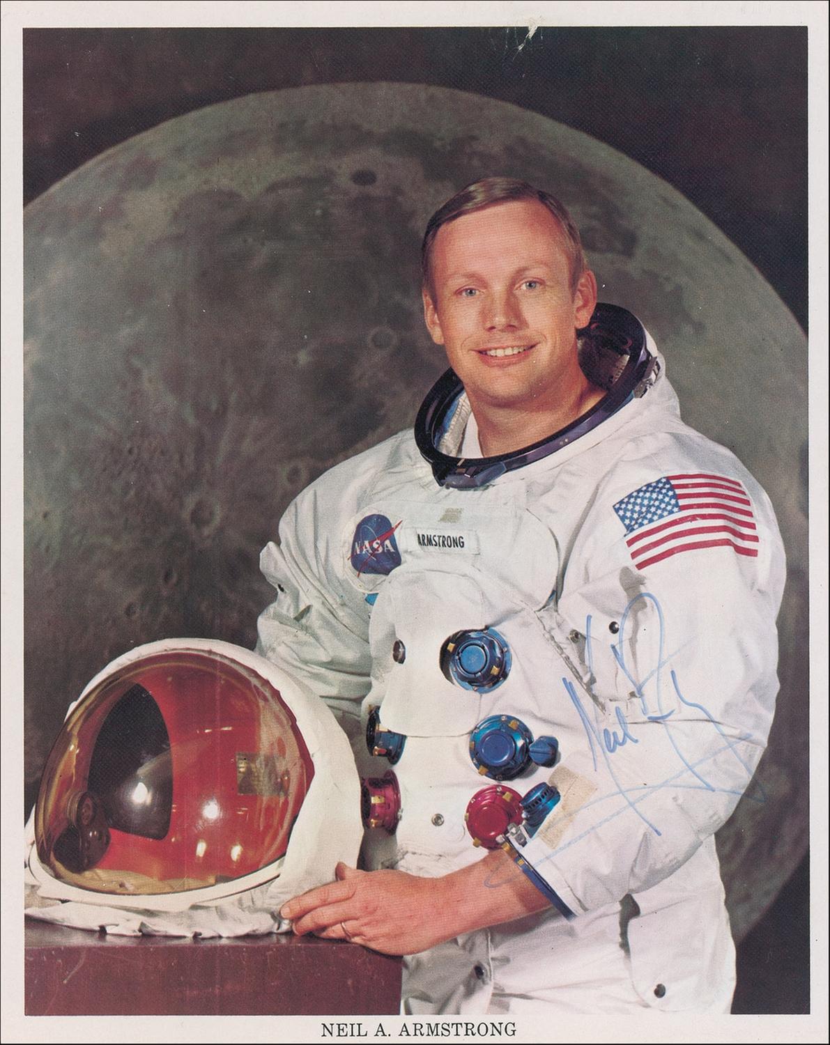 Uninscribed color 8 x 10 NASA photo of Armstrong posing in his spacesuit against a lunar background, signed in blue felt tip. In fine condition, with a couple of paperclip impressions to top edge, as well as some light scuffing resulting in just a bit of surface loss, and trivial corner tip dings.