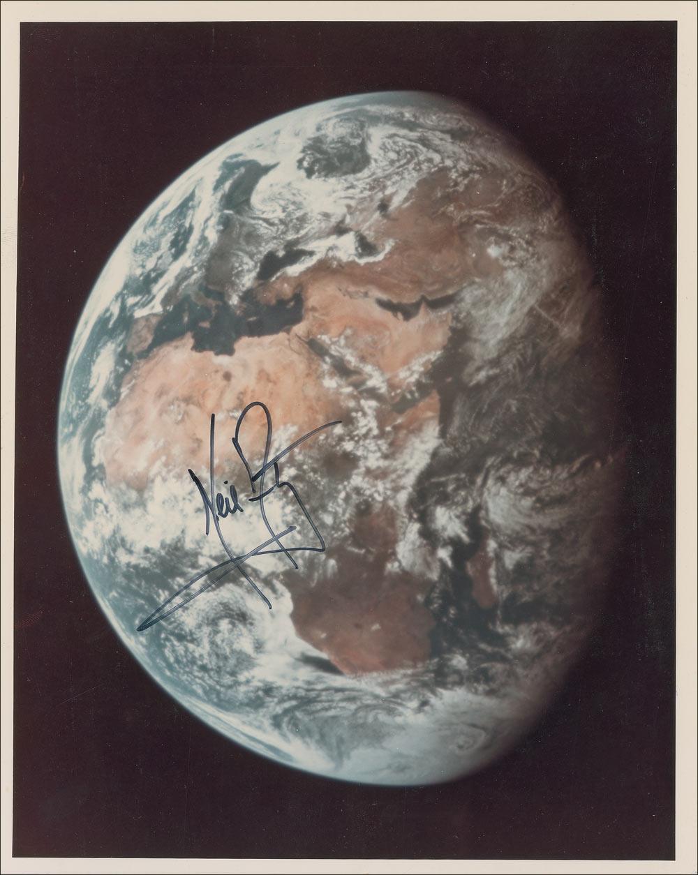Color satin-finish 8 x 10 photo of the Earth as seen from space, signed in black felt tip. In fine condition. A lesser-seen uninscribed image from this most desirable of moonwalkers!