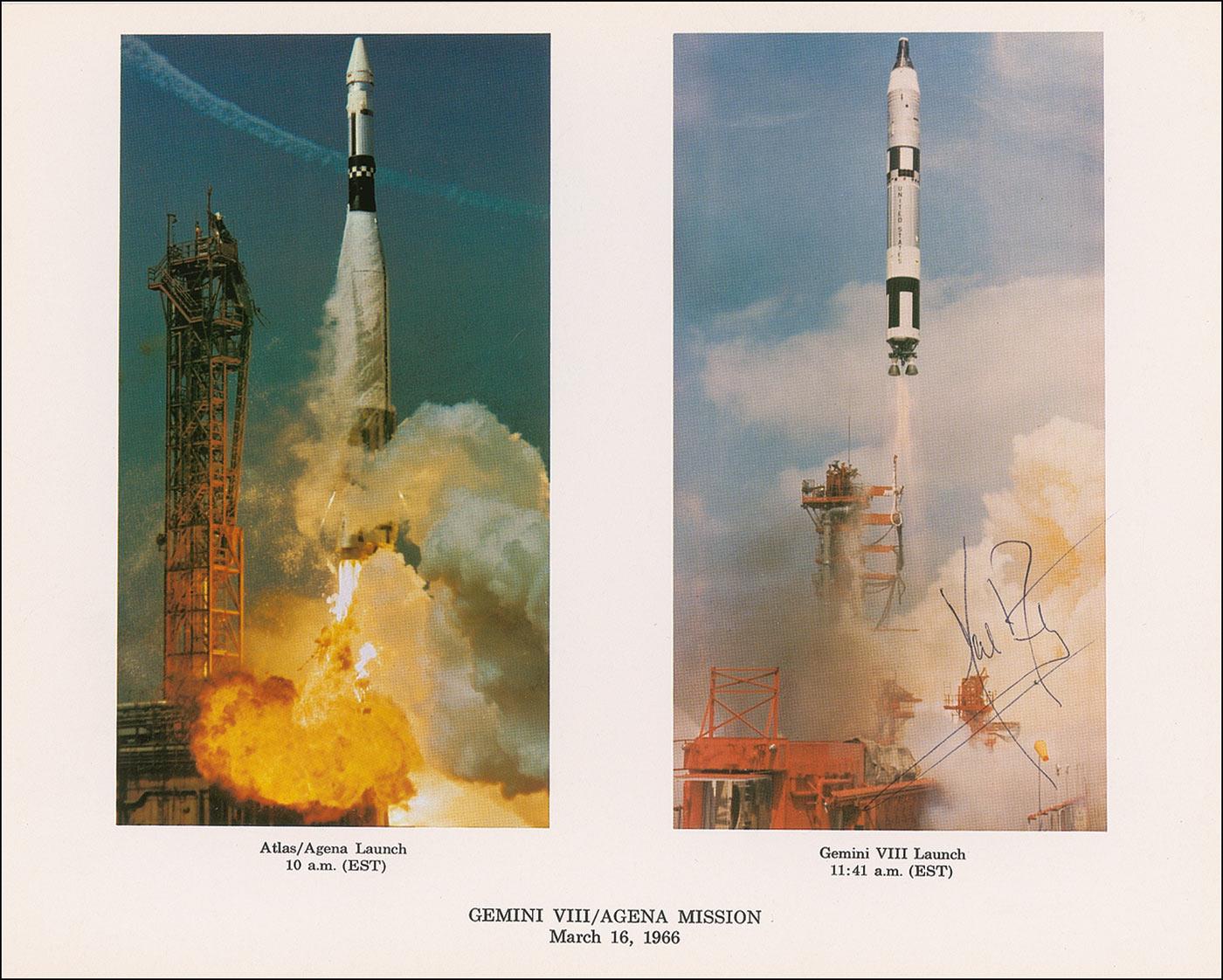 Color 10 x 8 composite cardstock photo of the launch of the Gemini VIII capsule and Agena, signed in blue ballpoint by Armstrong. In very fine condition.