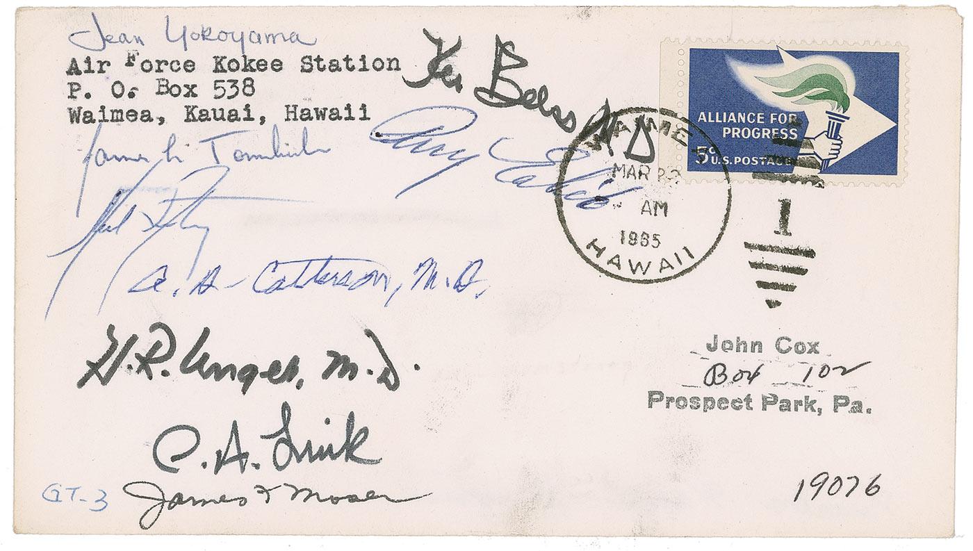 Mailing envelope, 6.5 x 3.5, with a return address of Air Force Kokee Station in Hawaii, signed in blue ballpoint by Neil Armstrong. Also signed by NASA doctor A. D. Catterson, as well as seven other members of the tracking station, signing in ballpoint and felt tip. In fine condition, with a trivial brush to Armstrong’s signature, and some scattered light soiling.