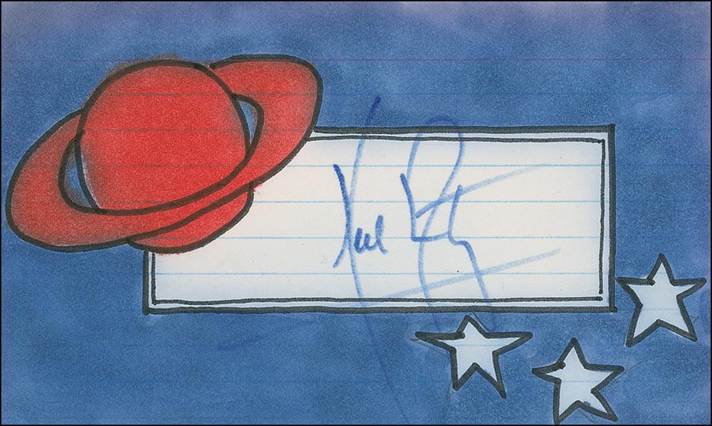 Felt tip signature, “Neil Armstrong,” on an off-white 5 x 3 lined card, which has been heavily decorated around the signature. In fine condition, with small portions of signature and paraph extending into the colored area.