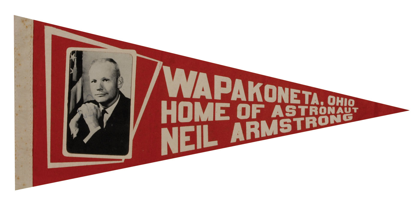 Red felt pennant measuring approximately 19 inches in length, designed with a 3 x 5 photo of Armstrong in a suit and tie, signed in blue ink, “Neil Armstrong.” The pennant is from a homecoming celebration in Wapakoneta, Ohio. Spots of toning, vertical creases, and Armstrong’s signature a little light.