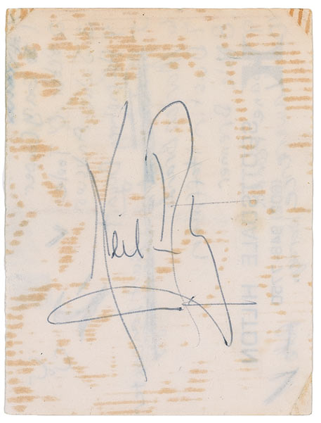 Ballpoint signature, “Neil Armstrong,” on an off-white 3 x 4 slip. Central horizontal fold crossing his signature, a few other creases, diagonal lines from magnetic photo album, and show-through from printing and handwriting on reverse, otherwise very good condition. Accompanied by a full letter of authenticity from PSA/DNA.
