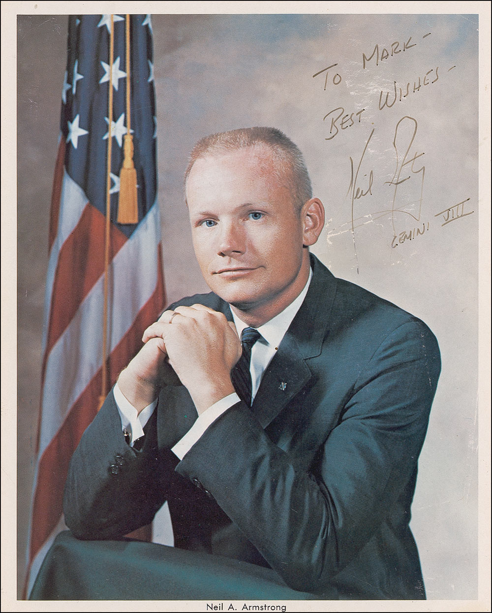 Vintage color 8 x 10 NASA photo of Armstrong in civilian clothing, signed and inscribed in black felt tip, “To Mark—Best Wishes—Neil Armstrong, Gemini VIII.” In very good condition, with upper right corner crease, surface scratches that touch his face and portions of signature and inscription, scattered staining, and an irregular block of soiling. A unique sentiment that pre-dates the moonwalker’s involvement with the Apollo program. Accompanied by a letter of authenticity from the photograph’s original recipient stating this photo was originally obtained for him by a former mayor of Armstrong’s hometown of Wapakoneta, Ohio.