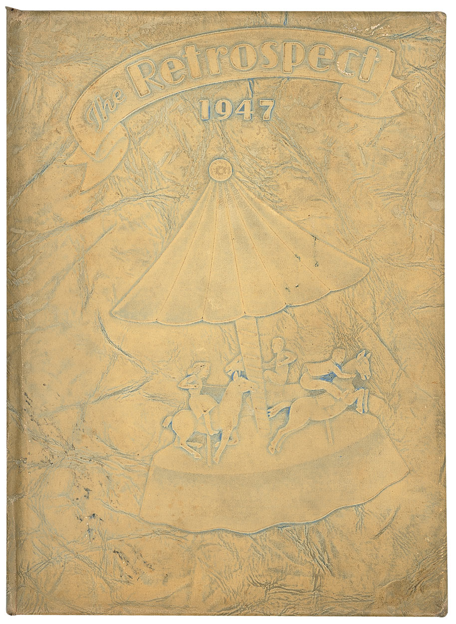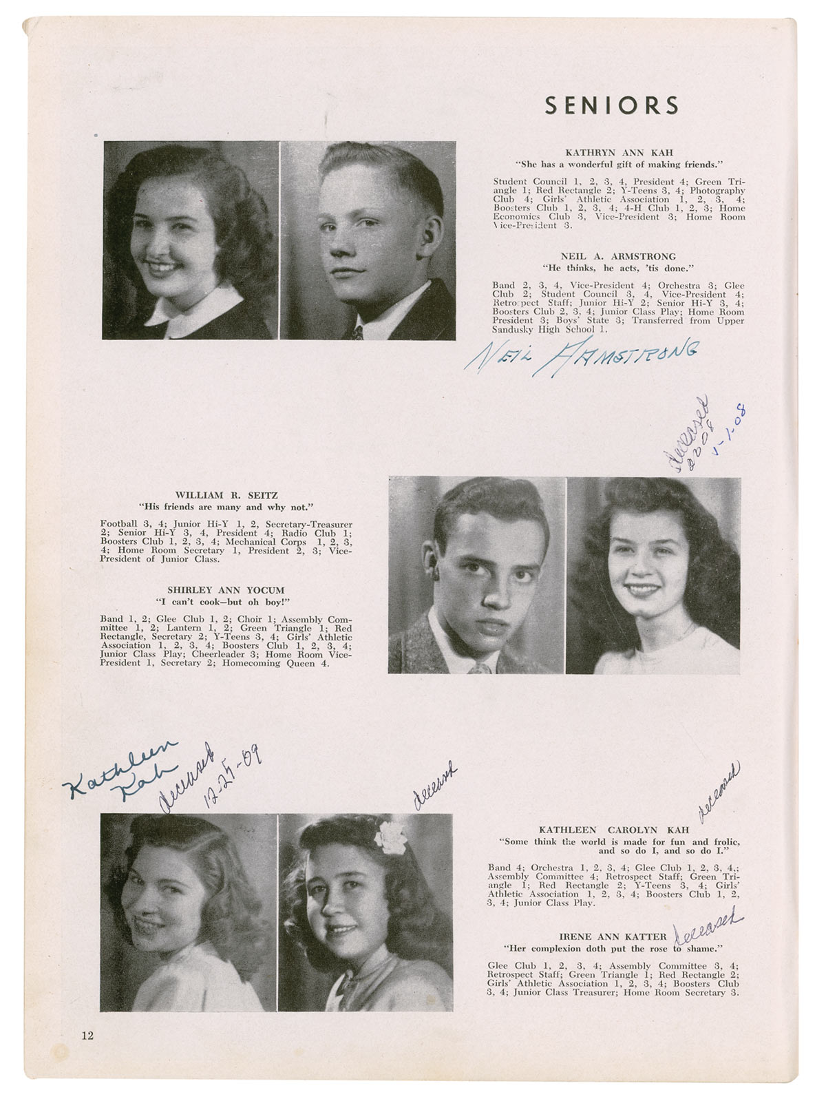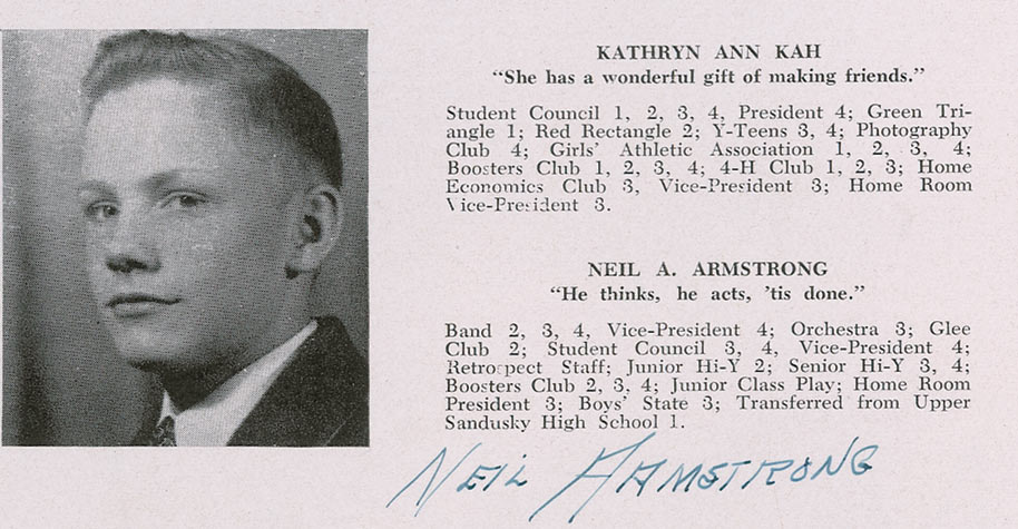 The Retrospect yearbook, dating from Armstrong’s senior year at Blume High School in Wapakoneta, Ohio in 1947, hardcover, 8 x 11, 88 pages. Armstrong’s senior portrait is at the top of page 12, and signed in ink under his activities, “Neil Armstrong.” Among the activities he participated in during his three years at school are “Band (2,3,4) Vice-President 4,” and “Student Council 3,4.” Armstrong is pictured an additional six times in the yearbook, two in the band (one with the other officers), two for Student Council (one with the other officers), and two with the Senior Hi–Y, whose information reads, in part: “Clean Living–self-discipline in everyday life, Clean Speech–decency in conversation, Clean Scholarship–honesty in school, Clean Sportmanship–fairness in athletics.” Other classmates have also signed the book, with later notations added concerning deceased students and staff. In very good condition, with inside pages separated from covers, scattered light creases to inside pages, toning to fore-edges, and wear and soiling to covers. Armstrong graduated 11th in his class of 78 students, and would go on to study aerospace engineering at Purdue University. His dedication to such creeds as those endorse by the Senior Hi–Y, including “clean living,” “self-discipline,” and “decency,” would go on to serve him well in life—especially in the Apollo 11 moon landing and the demands of a post-NASA life as a living legend. Any signed material from Armstrong’s teen years is extremely uncommon.