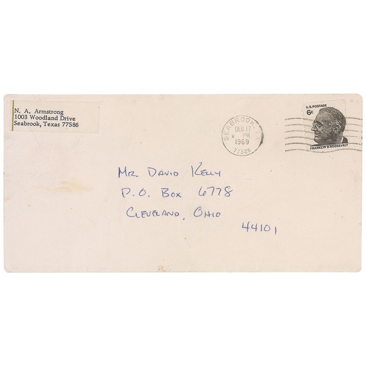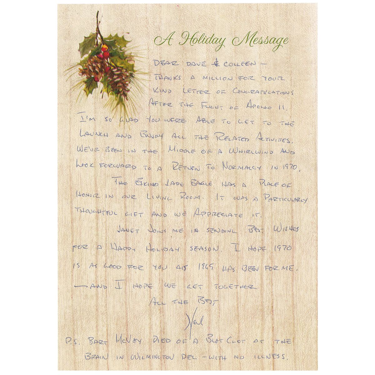 Rare ALS signed “Neil,” one page, 7 x 9.75, A Holiday Message letterhead, no date, but envelope postmarked December 17, 1969. Letter to David and Colleen Kelly. In full: “Thanks a million for your kind letter of congratulations after the flight of Apollo 11. I’m so glad you were able to get to the launch and enjoy all the related activities. We’ve been in the middle of a whirlwind and look forward to a return to normalcy in 1970. The Eskimo jade eagle has a place of honor in our living room. It was a particularly thoughtful gift and we appreciate it. Janet joins me in sending best wishes for a happy holiday season. I hope 1970 is as good for you as 1969 has been for me—and I hope we get together.” Under his signature, Armstrong adds, “P.S. Bart McNey died of a blood clot at the brain in Wilmington Del—with no illness.” In fine condition, with two horizontal mailing folds and a trivial crease to top left corner. Accompanied by the original mailing envelope, addressed in Armstrong’s hand