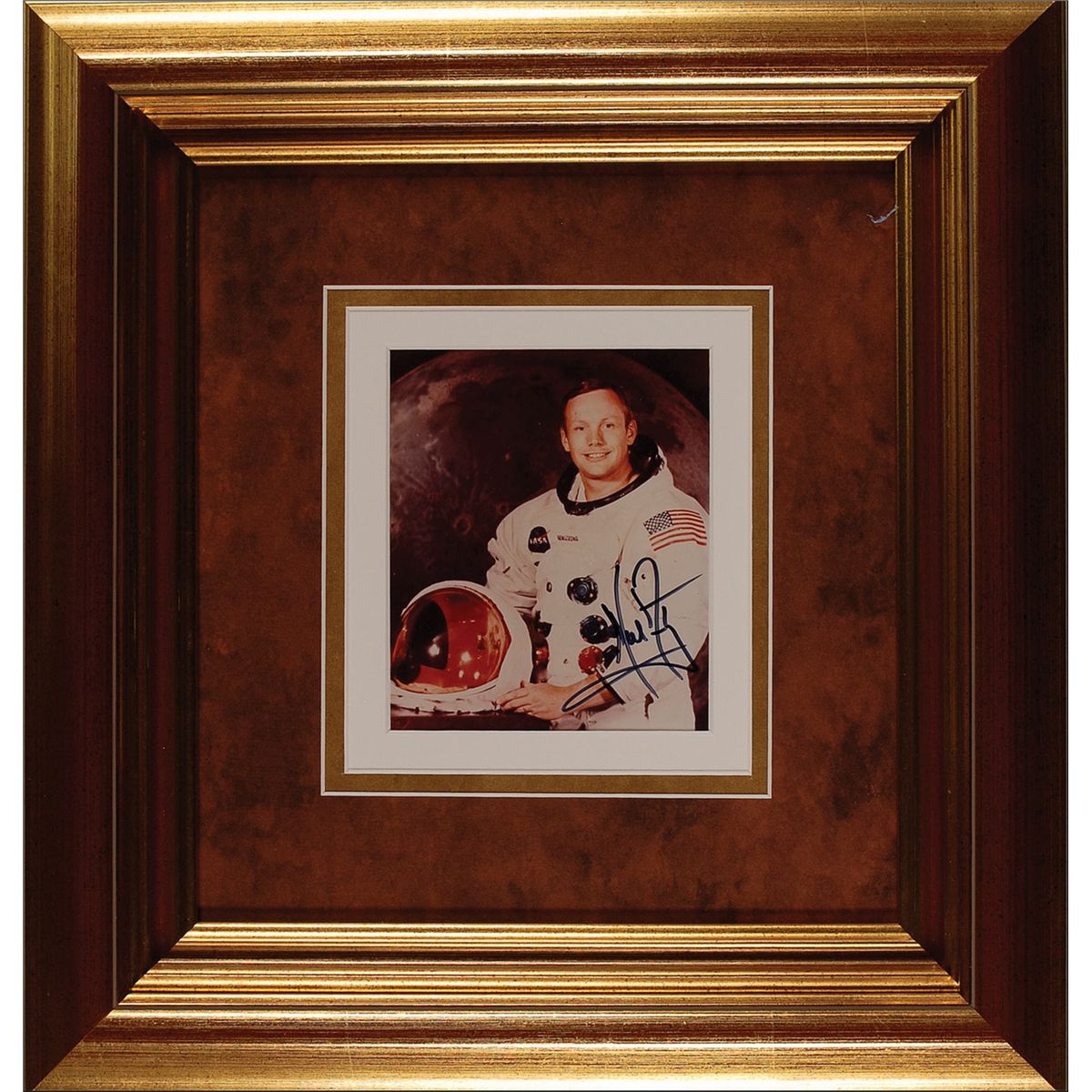 Color 4.5 x 5.25 photo of Armstrong posing in his white space suit, his helmet by his side, signed in black felt tip. Triple suede matted and framed to an overall size of 15 x 16. In fine condition.