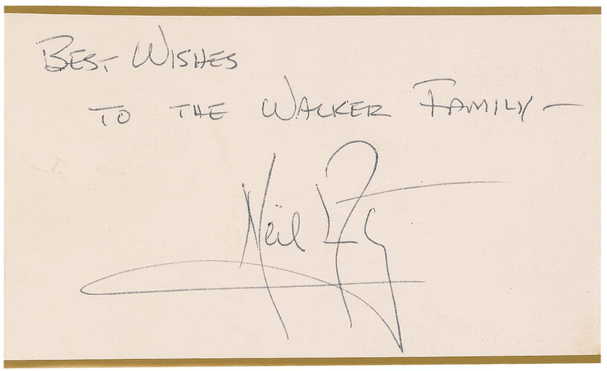Ballpoint signature and inscription, “Best wishes to the Walker family—Neil Armstrong,” on an off-white 5 x 3 gold-bordered card. In fine condition.