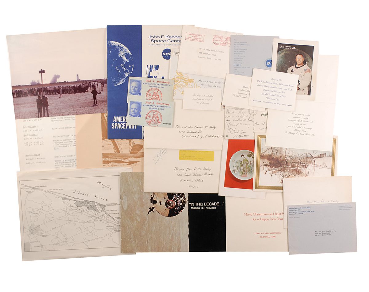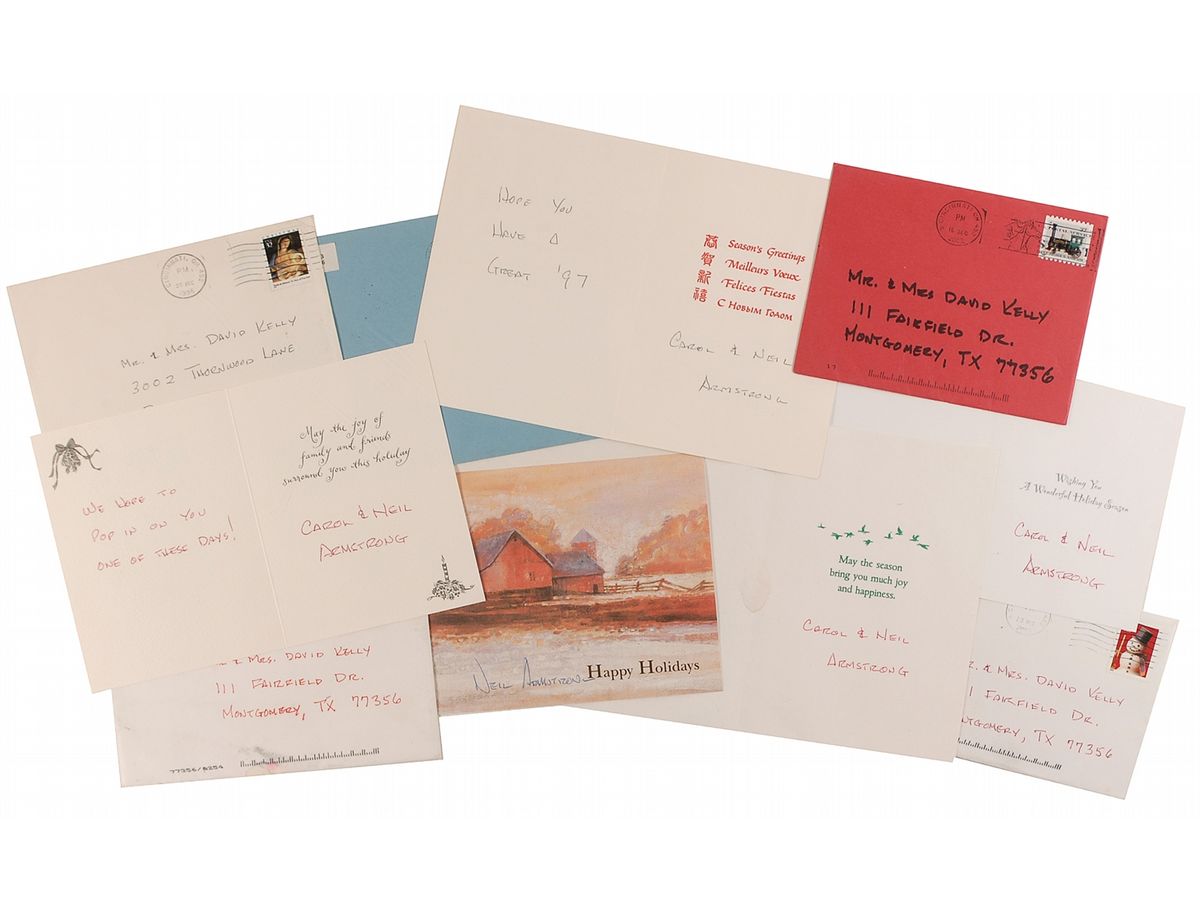 Collection of correspondence from Armstrong and his wife, in the form of Christmas cards, all to the same recipient, as well as assorted unsigned items relating to Apollo 11. Included are five Christmas cards signed by Neil Armstrong, which are signed as follows: (1990) “Neil Armstrong”; (1996) “Carol & Neil Armstrong,” adding “Hope you have a great ‘97,” on the adjacent side; (1999) “Carol & Neil Armstrong”; (2002) “Carol & Neil Armstrong,” adding “We hope to pop in on you one of these days!”; and (2003) “Carol & Neil Armstrong.” Each of the cards are accompanied by their original mailing envelopes, each addressed in Armstrong’s hand.