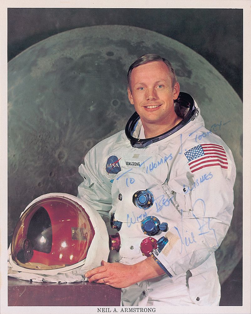 Color 8 x 10 NASA photo of Armstrong posing in his white space suit, his helmet by his side, signed and inscribed in blue felt tip “To Thomas J. Toomey—With best wishes, Neil Armstrong.” A couple slight bends, creases to lower left corner tip, and signature and inscription a few shades light, but completely legible, otherwise fine condition.